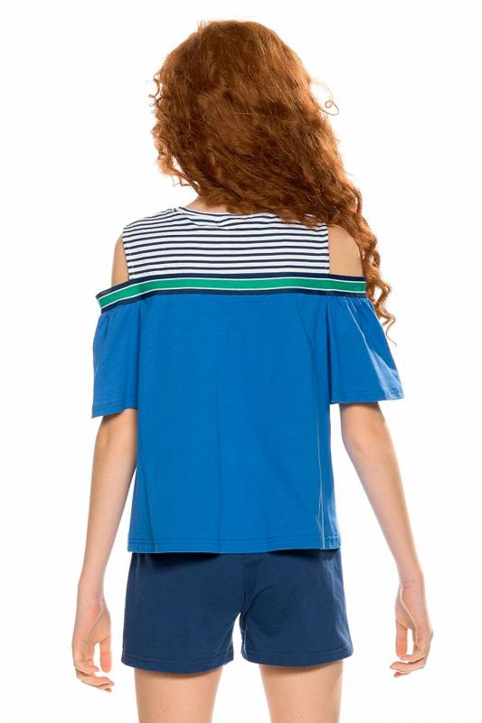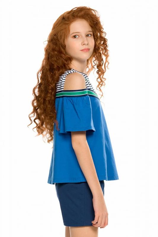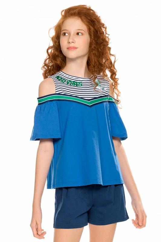 Комплект для девочек футболка и шорты. Футболка свободного объема с открытыми плечами и рукавами воланами. По всей линии груди проходит декоративная трикотажная лента, которая спереди формирует угол. Принт в виде птички колибри и надписи с разноцветным глиттером, перевод Новая атмосфера . Шорты свободного силуэта с защипами спереди и регулировкой объема шнуром.