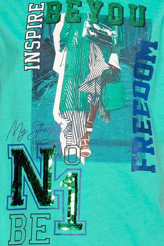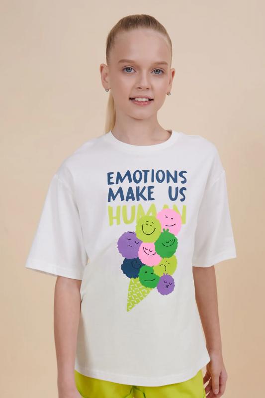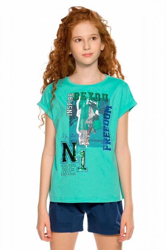 Комплект для девочек футболка и шорты. Футболка свободного объёма с цельнокроеным рукавом с отгибающимся закрепленным отворотом. Фотопринт с разноцветным глиттером и вышивкой переливающимися переворачивающимися пайетками. Перевод Вдохновляю быть свободной, Будь первой , Мой стритстайл . Шорты свободного силуэта с защипами спереди и внутренней регулировкой объема.