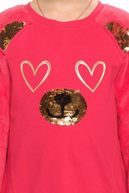 Комплект для девочек туника и лосины. Туника из футера с рукавами реглан из велсофта. На переде рельефные швы, создающие силуэт лёгкий бочонок. В швах рукава вшиты декоративные ушки, расшитые золотистыми пайетками. По переду принт из мягких стойких золотых сердечек и вышивки из пайеток, имитирующие мордочку медведя. Лосины из эластичного футера с начесом.