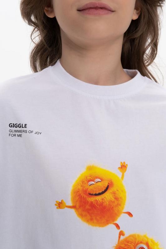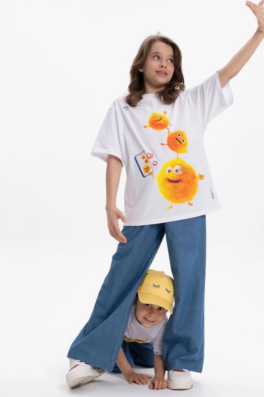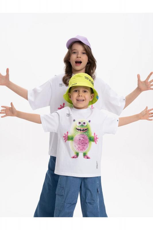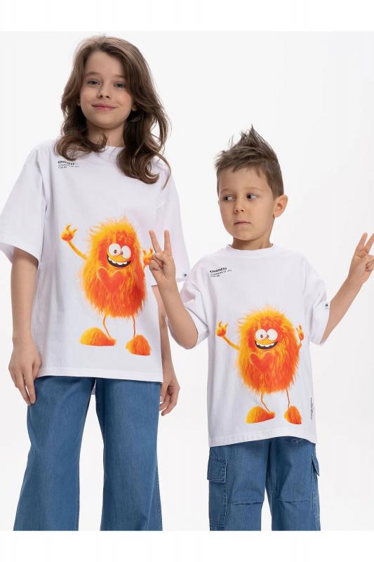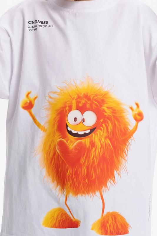 Детская футболка унисекс среднего объема. Прикольная нарядная футболка свободного силуэта со спущенным плечом не будет стеснять движений ребёнка. Вырез горловины отделан эластичной рибаной - голова не застрянет. Главная фишка футболки — яркий милый принт, изображающий персонажа, сгенерированного нейросетью (искусственным интеллектом). Это супермодный тренд! Принт эластичный и стойкий — без проблем переносит многочисленные стирки, не теряя своей яркости. На принте изображён забавный пушистый чудик (монстрик) оранжевого цвета + надписи "