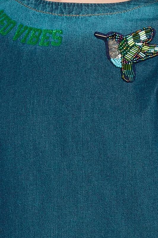 Детская футболка унисекс среднего объема. Прикольная нарядная футболка свободного силуэта со спущенным плечом не будет стеснять движений ребёнка. Вырез горловины отделан эластичной рибаной - голова не застрянет. Главная фишка футболки — яркий милый принт, изображающий персонажа, сгенерированного нейросетью (искусственным интеллектом). Это супермодный тренд! Принт эластичный и стойкий — без проблем переносит многочисленные стирки, не теряя своей яркости. На принте изображён забавный пушистый чудик (монстрик) зеленого и сиреневого цветов + надписи "