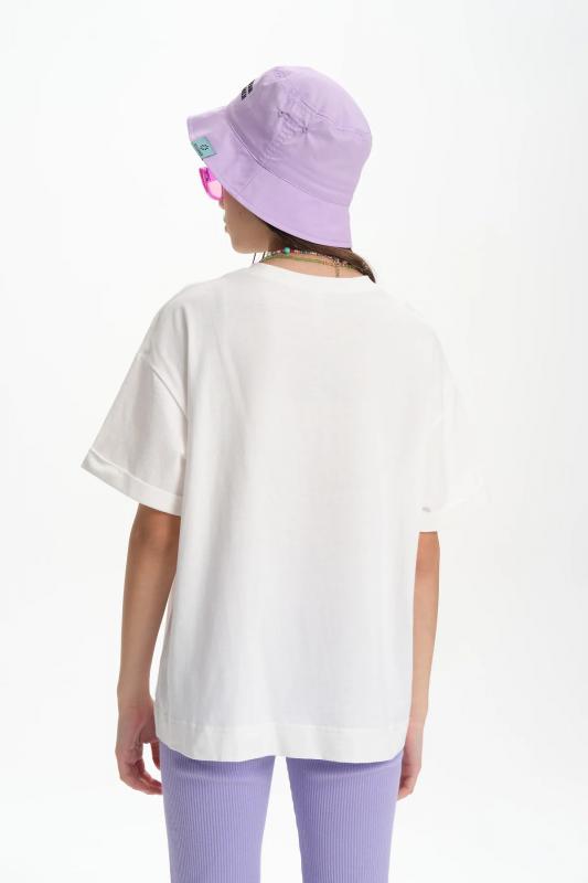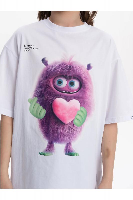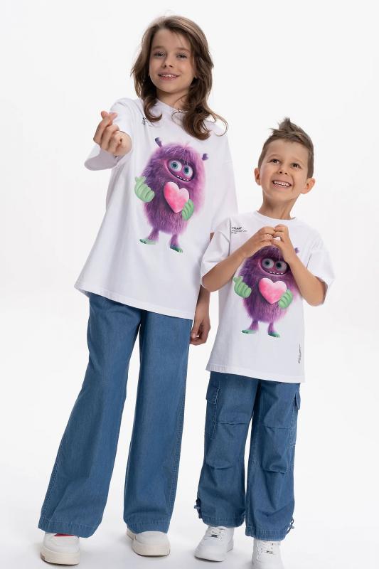 Детская футболка унисекс среднего объема. Прикольная нарядная футболка свободного силуэта со спущенным плечом не будет стеснять движений ребёнка. Вырез горловины отделан эластичной рибаной - голова не застрянет. Главная фишка футболки — яркий милый принт, изображающий персонажа, сгенерированного нейросетью (искусственным интеллектом). Это супермодный тренд! Принт эластичный и стойкий — без проблем переносит многочисленные стирки, не теряя своей яркости. На принте изображён забавный пушистый чудик (монстрик) фиолетового цвета с сердечком + надписи "