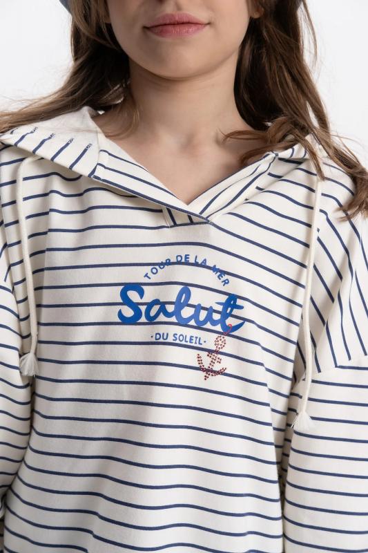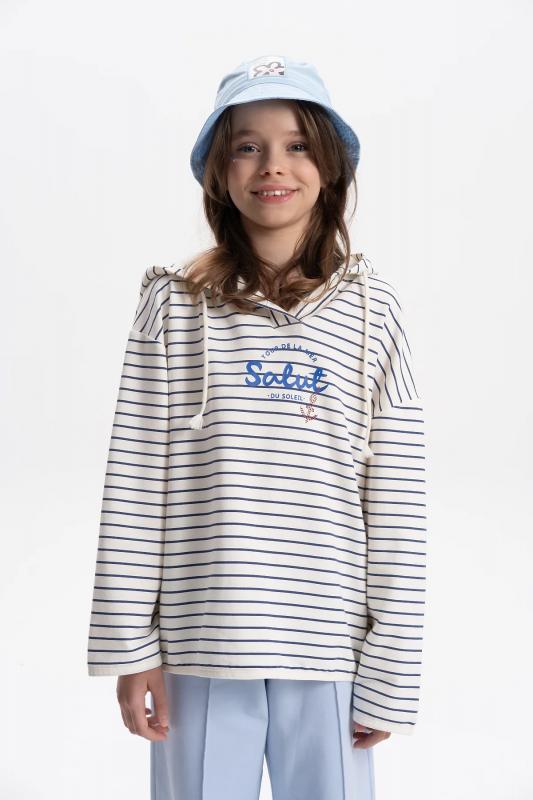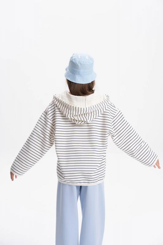 Свитшот в полоску с принтом тельняшка, подходит для девочки подростка. Модный джемпер из высококачественного хлопкового футера можно носить круглый год весной, летом, осенью и зимой. Кофта с капюшоном подойдет для повседневной носки на занятия, в школу, в сад и на прогулку. Идеально для подарка на любой праздник.