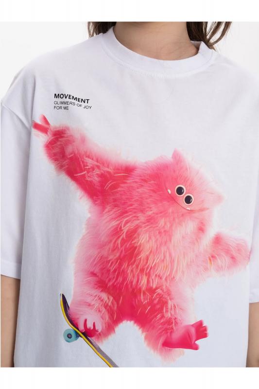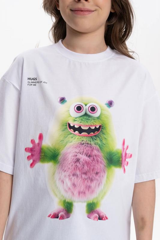 Детская футболка унисекс среднего объема. Прикольная нарядная футболка свободного силуэта со спущенным плечом не будет стеснять движений ребёнка. Вырез горловины отделан эластичной рибаной - голова не застрянет. Главная фишка футболки — яркий милый принт, изображающий персонажа, сгенерированного нейросетью (искусственным интеллектом). Это супермодный тренд! Принт эластичный и стойкий — без проблем переносит многочисленные стирки, не теряя своей яркости. На принте изображён забавный пушистый чудик (монстрик) розового цвета + надписи "