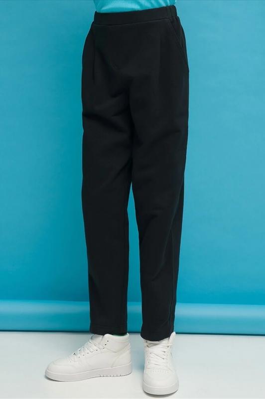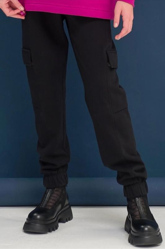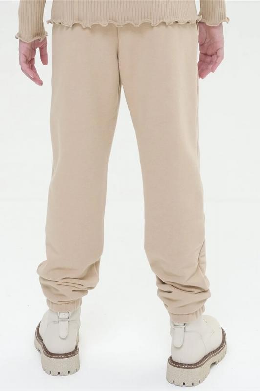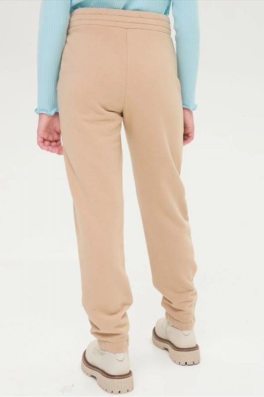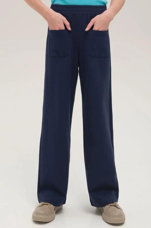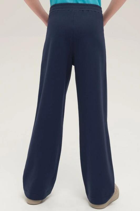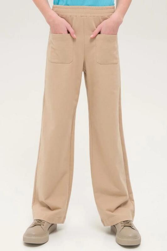 Брюки для девочек из трикотажного полотна с эластаном. Небольшой объем по бедрам, карманы в боковых швах, пояс на резинке дополнен внутренним шнурком для регулировки объема. Лампасы из репсовой ленты в тон.