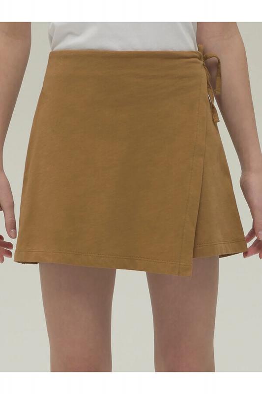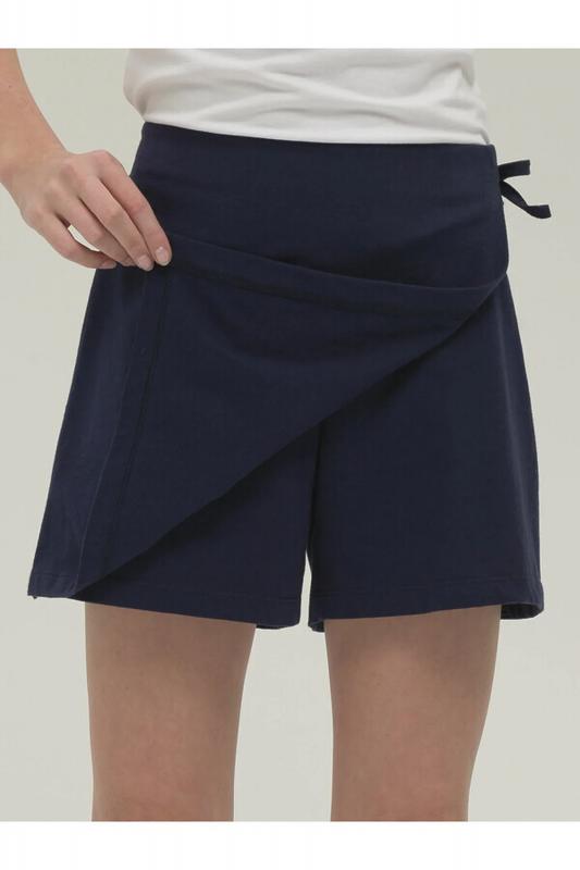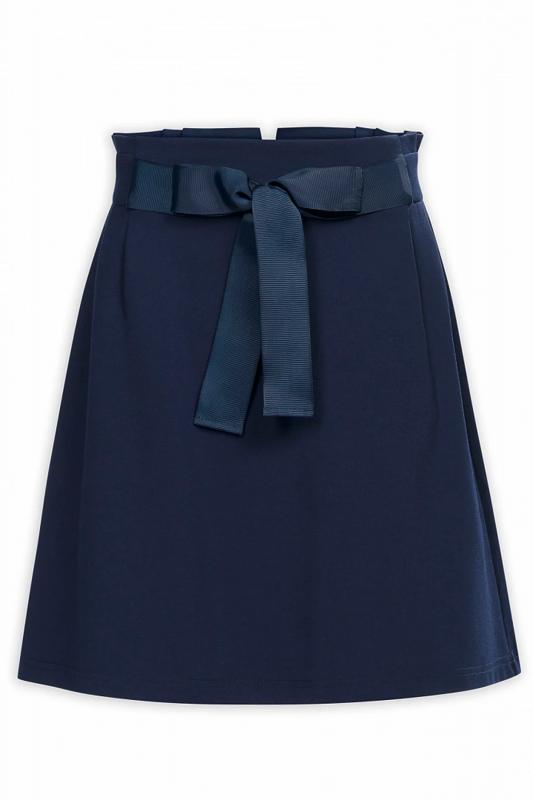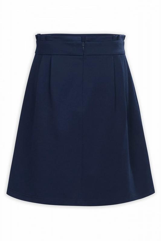 Юбка для девочек А-силуэта из плотного, но мягкого трикотажного полотна. Новинка. На спинке потайная молния в среднем шве. По бокам и на спинке обтачной фигурный пояс, в верхний край которого вшита декоративная деталь с защипами. Перед сложной формы, с вшитой репсовой лентой для завязывания на бант спереди или на узел сзади.