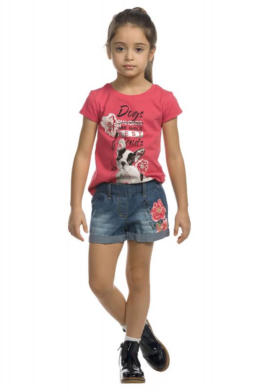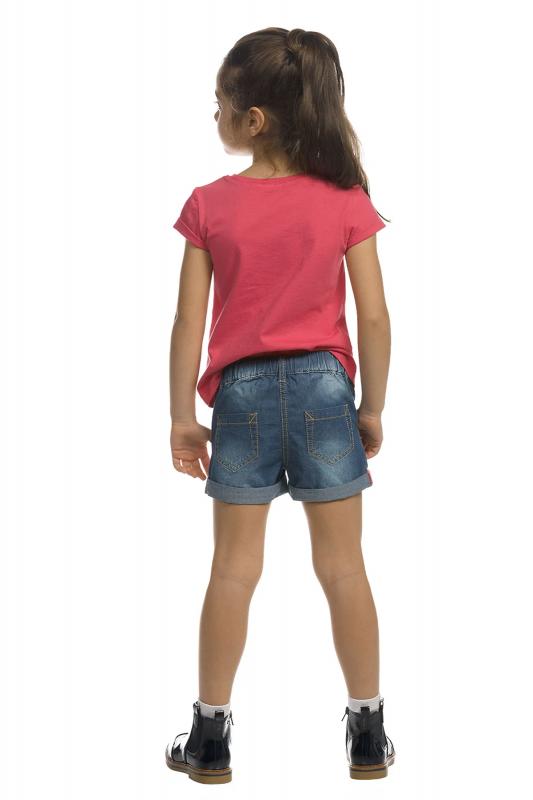 Шорты для девочек. Шорты свободного объёма из тонкой джинсы с отворотами. Полукруглые боковые карманы впереди и накладные карманы на спинке, металлическая фурнитура. Пояс на резине с внутренней регулировкой шнуром. По низу правого бокового шва деталь из декоративной тесьмы. Эластичный принт. Эластичный принт.