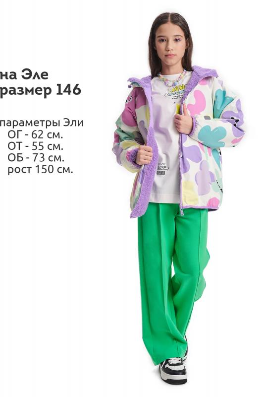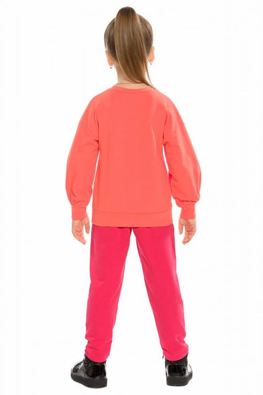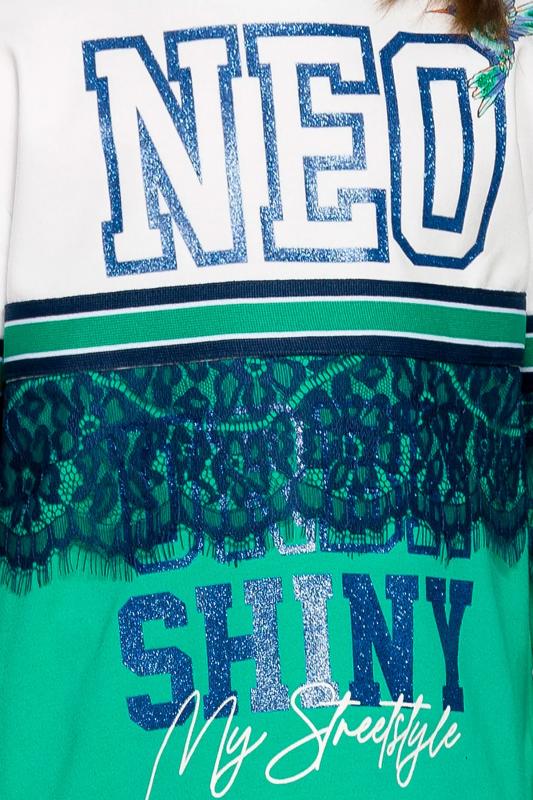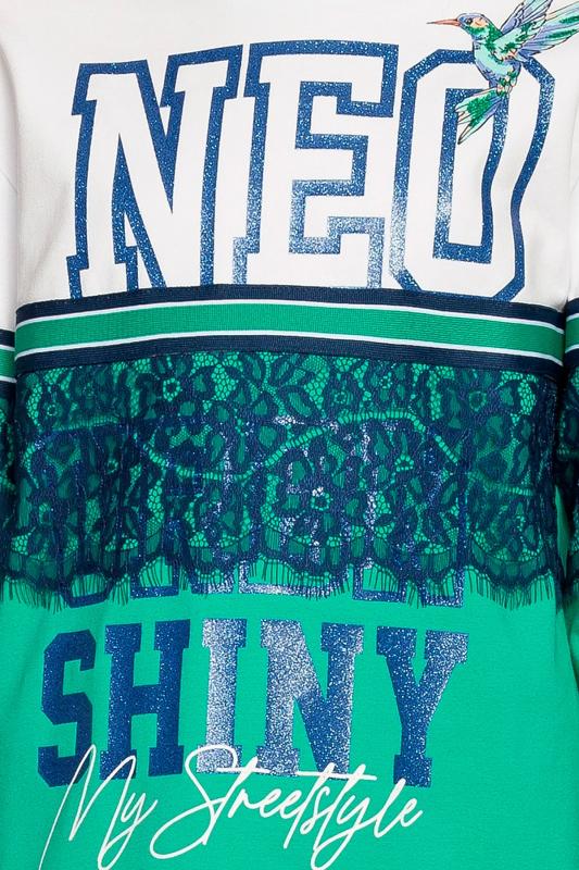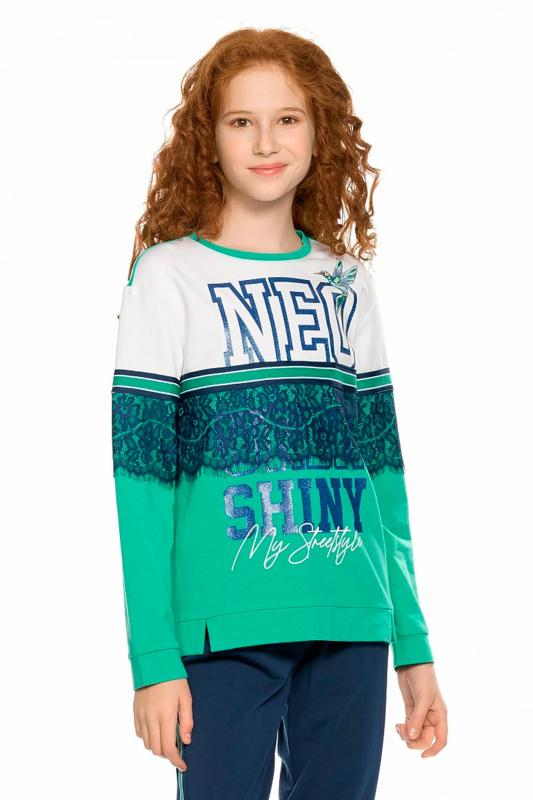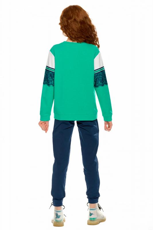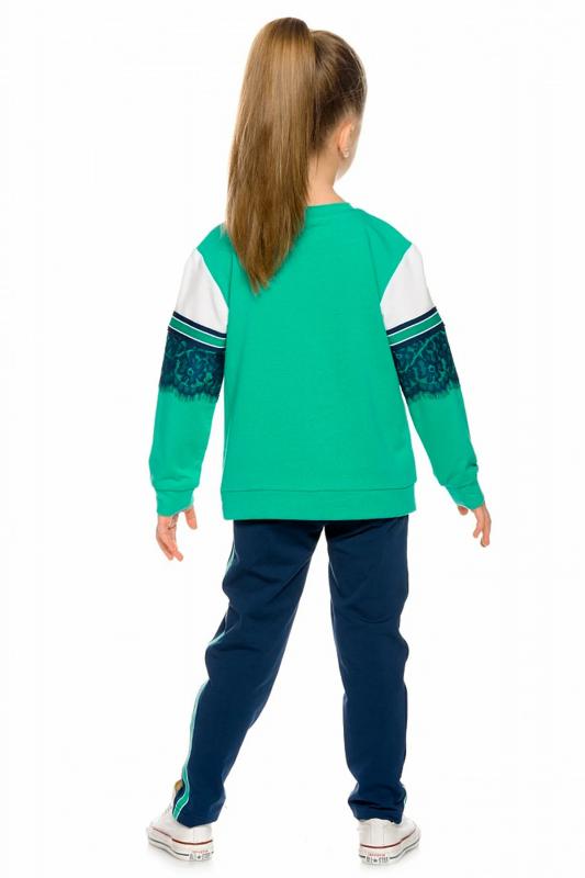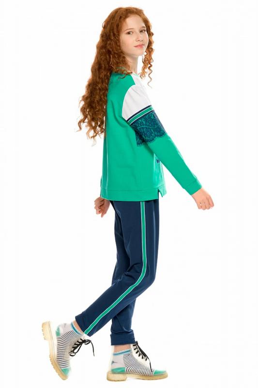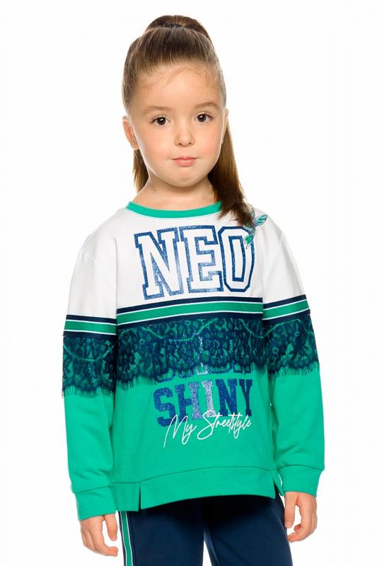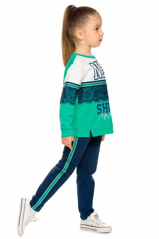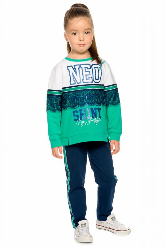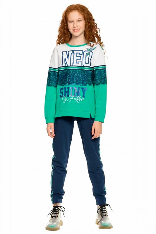 Комплект для девочек из эластичного футера свитшот и брюки. Мягкая линия плеча, силуэт оверсайз. По линии груди спереди и рукавах горизонтальное членение, вдоль которого проходит трикотажная декоративная тесьма и воздушное нежное кружево. Манжеты рукавов и низа изделия из основной ткани с разрезами. По переду изделия принт с разноцветным глиттером в виде птички колибри и надписей. Перевод Нео, Урбан, Блестящий, Мой стритстайл. Брюки зауженного книзу силуэта с трикотажной декоративной тесьмой по боковым швам и с внутренней регулировкой пояса.