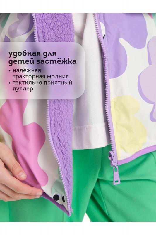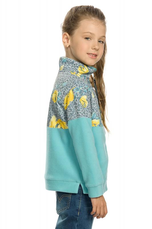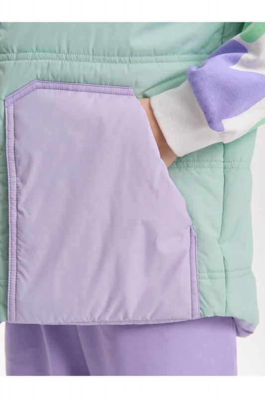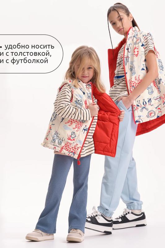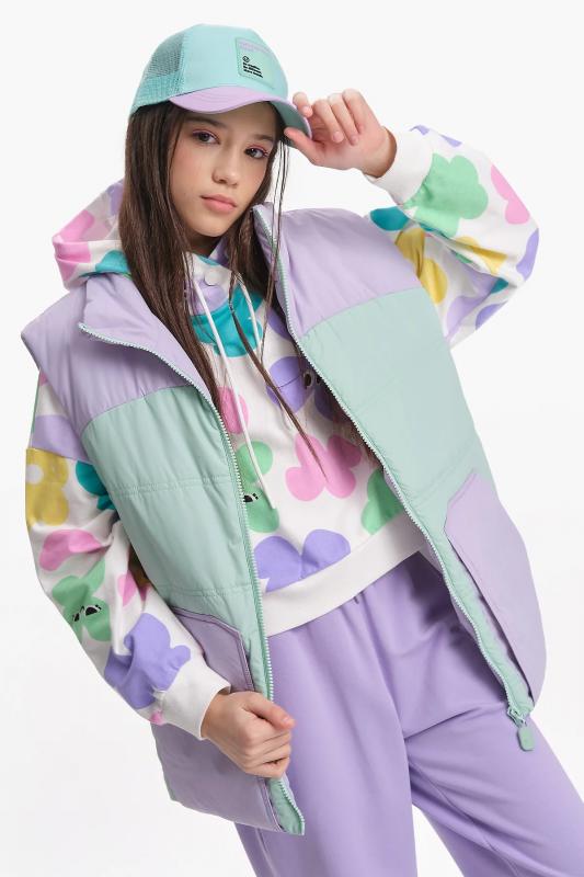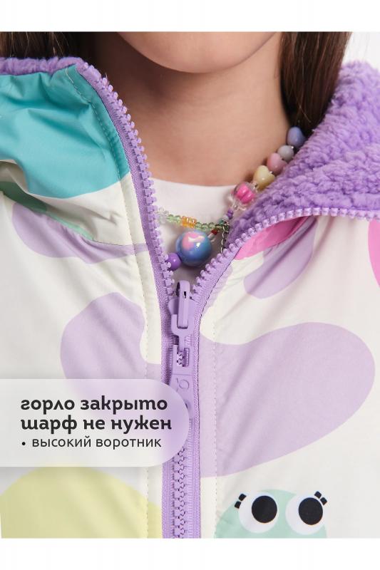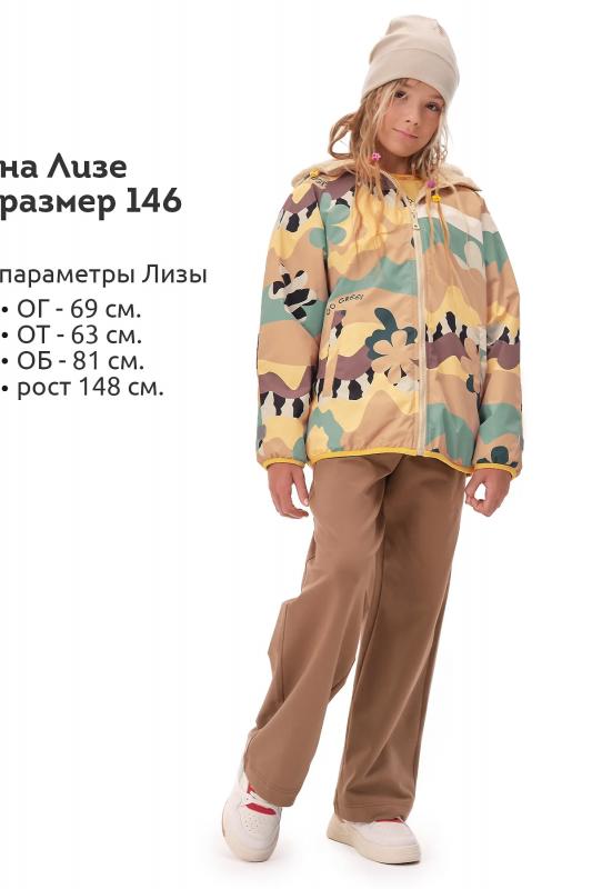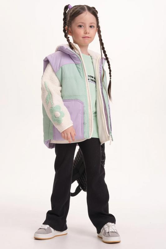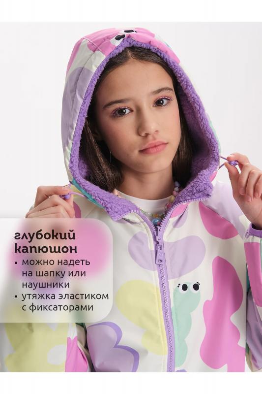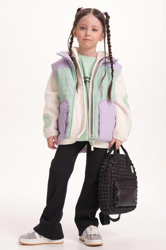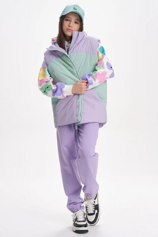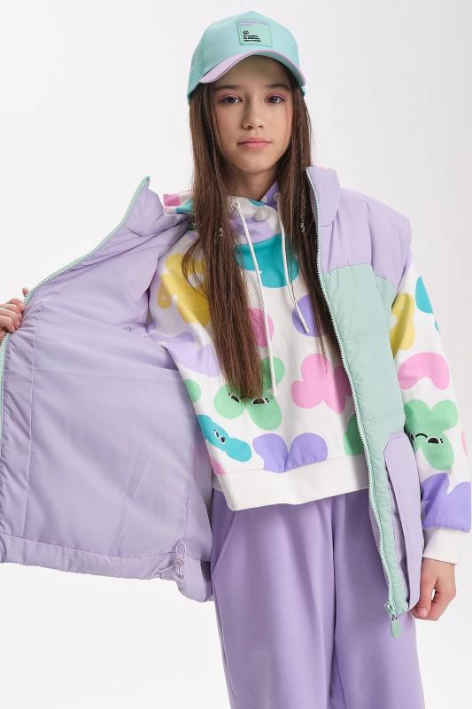 Комплект для девочек из эластичного футера свитшот и брюки. Мягкая линия плеча, силуэт оверсайз. По линии груди спереди и рукавах горизонтальное членение, вдоль которого проходит трикотажная декоративная тесьма и воздушное нежное кружево. Манжеты рукавов и низа изделия из основной ткани с разрезами. По переду изделия принт с разноцветным глиттером в виде птички колибри и надписей. Перевод Нео, Урбан, Блестящий, Мой стритстайл. Брюки зауженного книзу силуэта с трикотажной декоративной тесьмой по боковым швам и с внутренней регулировкой пояса.