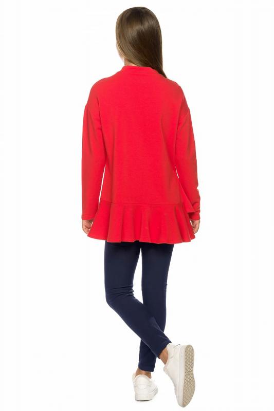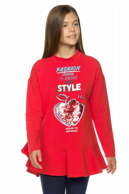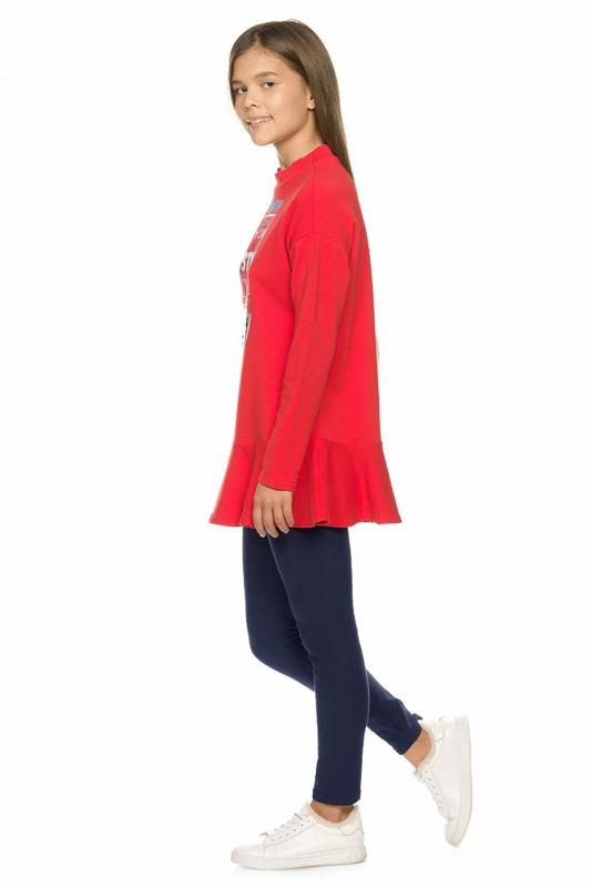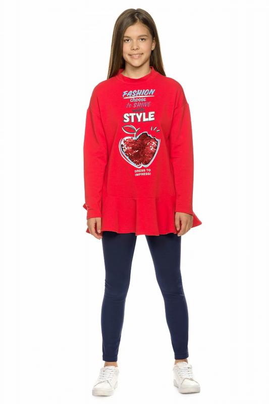 Костюм для девочек из футера: туника и лосины. Новинка кроя! Туника более свободного силуэта со спущенным плечом, рукава, слегка зауженные книзу, по низу изделия разноуровневый волан, поднимающийся вверх по правому боковому шву, аппликация в виде яблока из двусторонних пайеток, надпись с глиттером и золотистым блеском, перевод Мода выбирает сиять со стилем. Одевайся так, чтобы произвести впечатление. Утеплённые лосины из футера увеличенной формы для удобства надевания.
