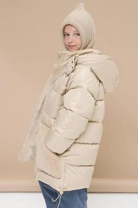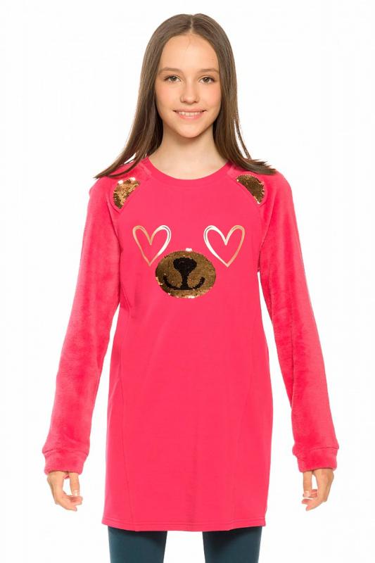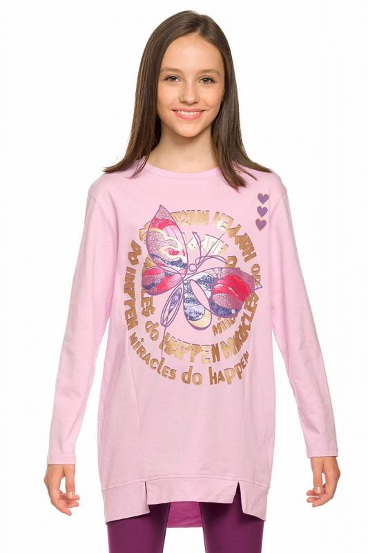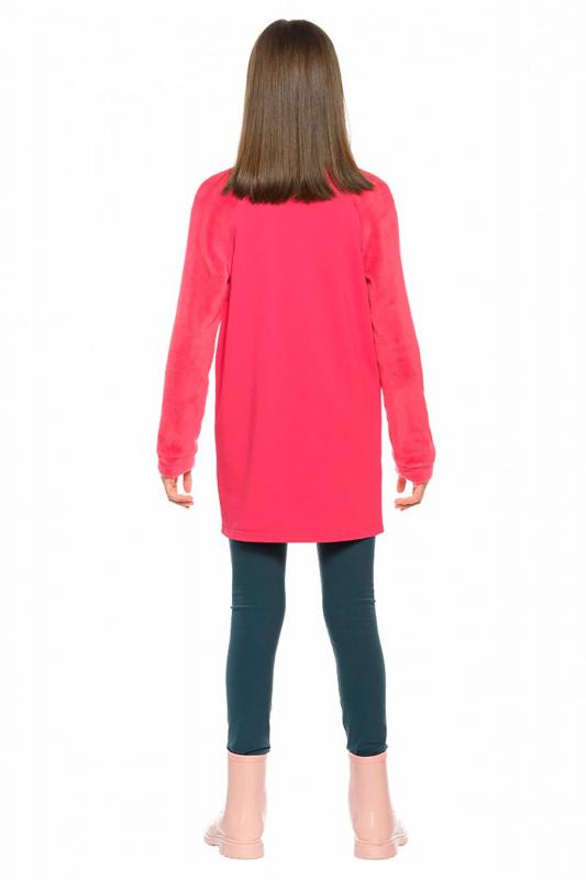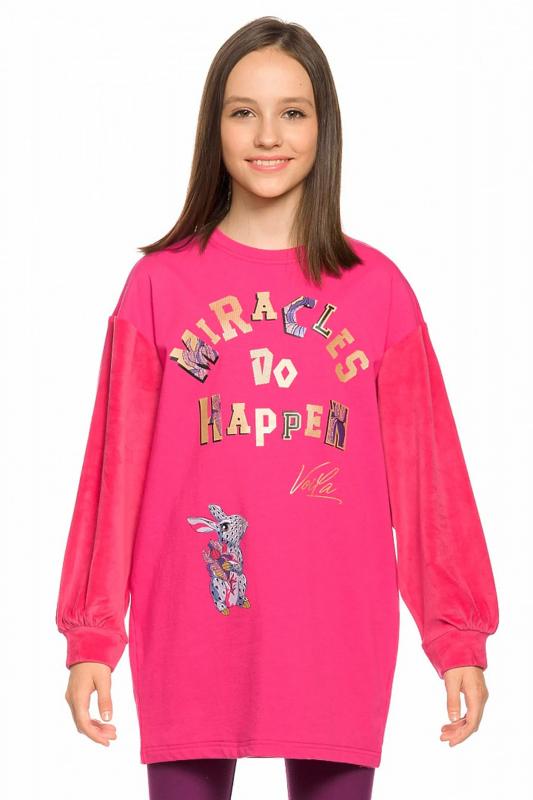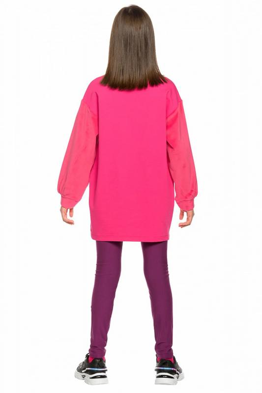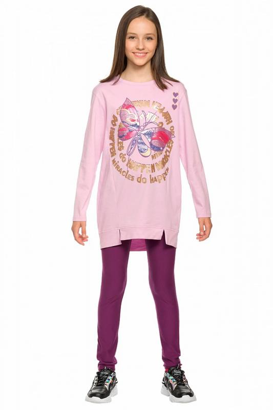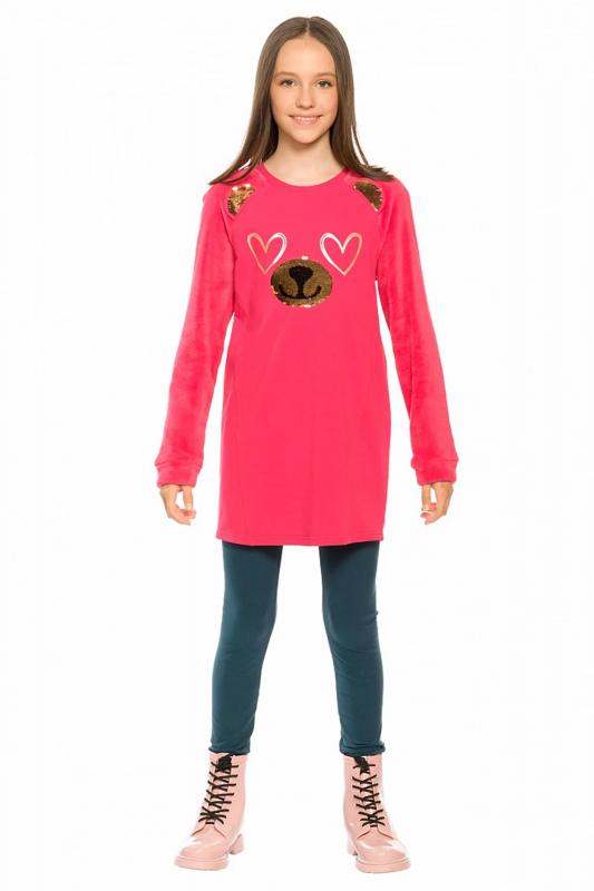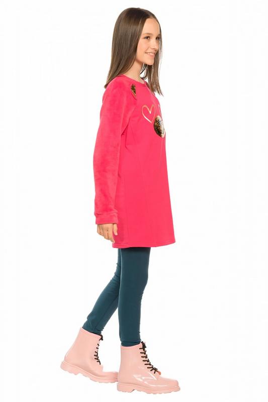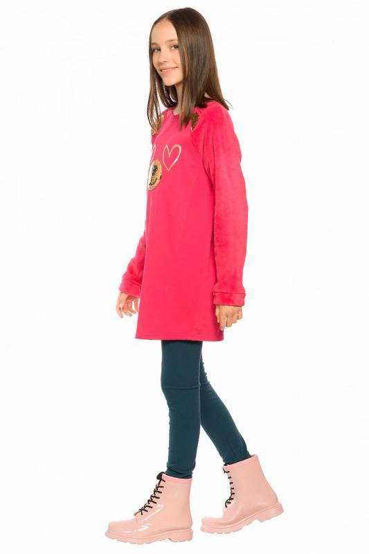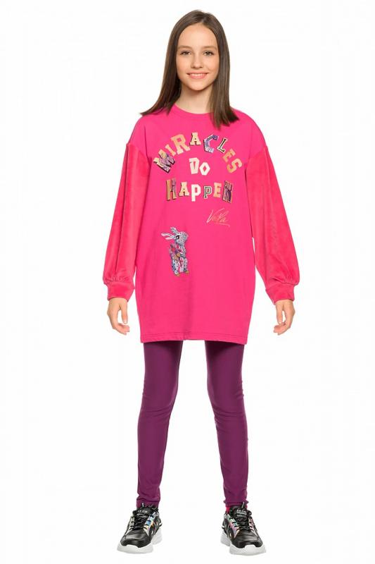 Комплект для девочек туника и лосины. Туника мягкого оверсайз силуэта со спущенной линией плеча. Перед и спинка из футера, рукава из мягкого плюшевого велюра с перламутровым отблеском. Эластичный rubber принт с золотым металликом и глиттером. Надпись Чудеса случаются. Вуаля. Низ Классические лосины из футера с начесом.