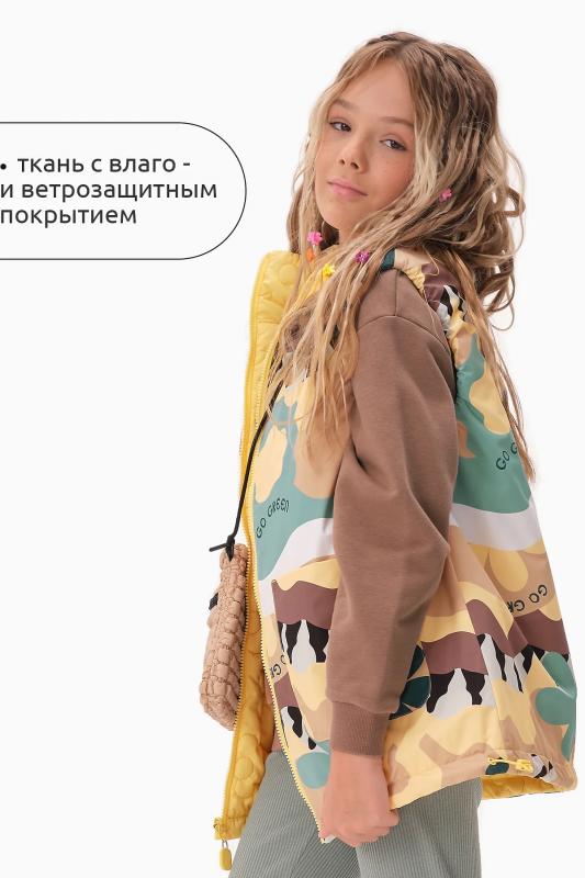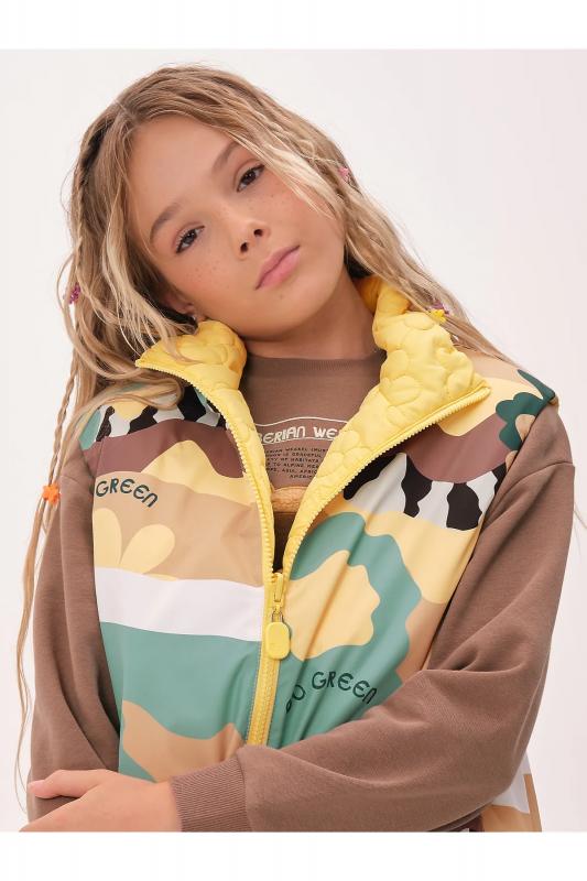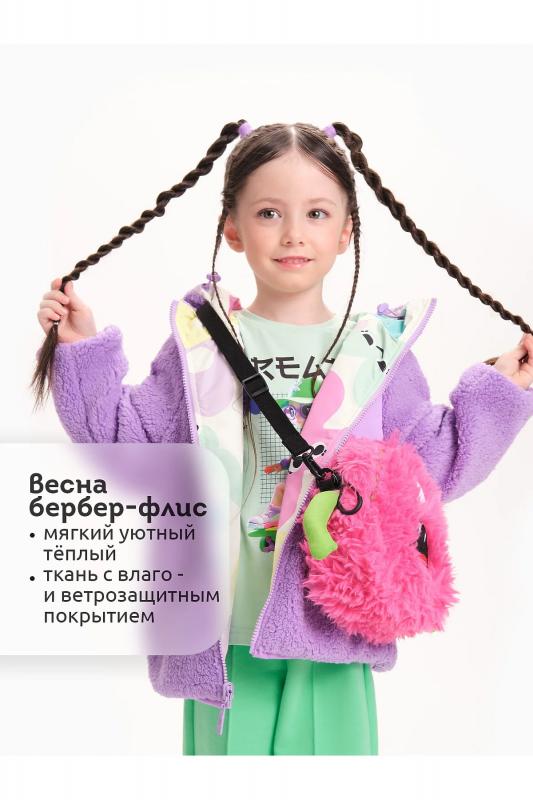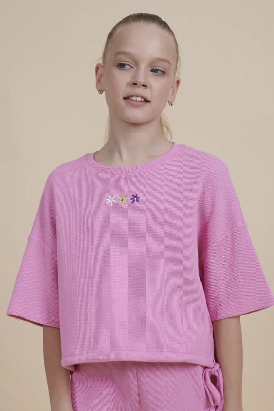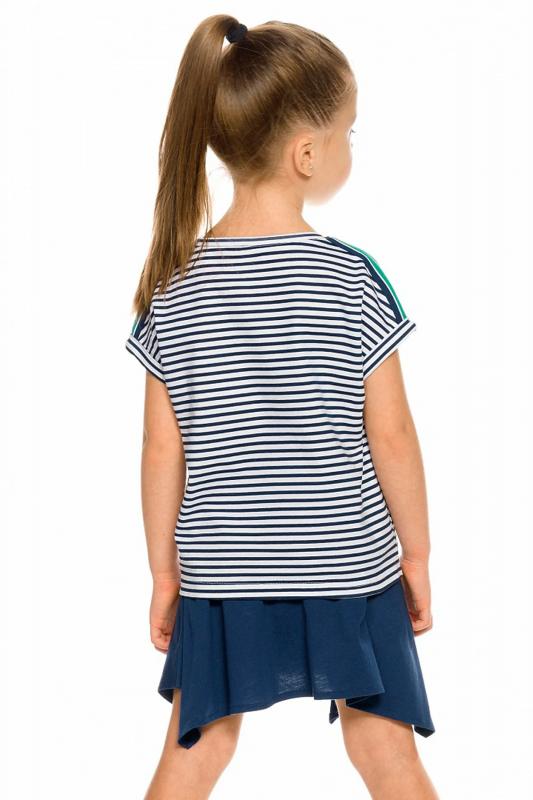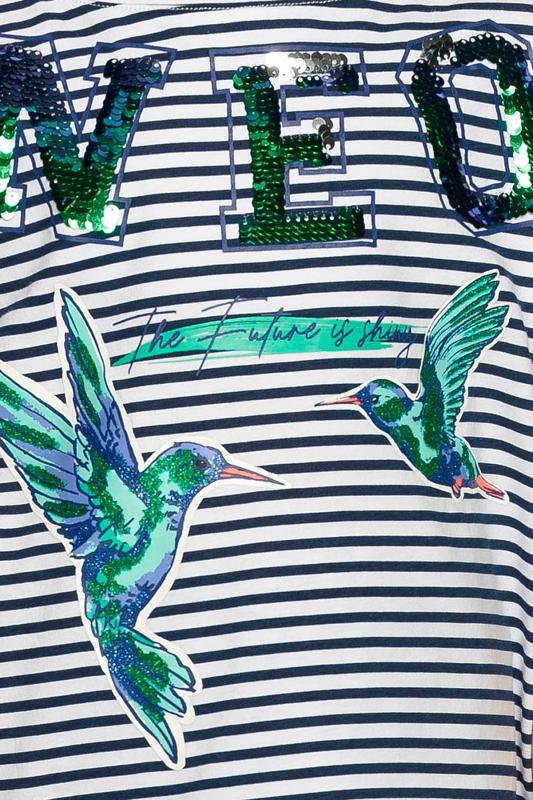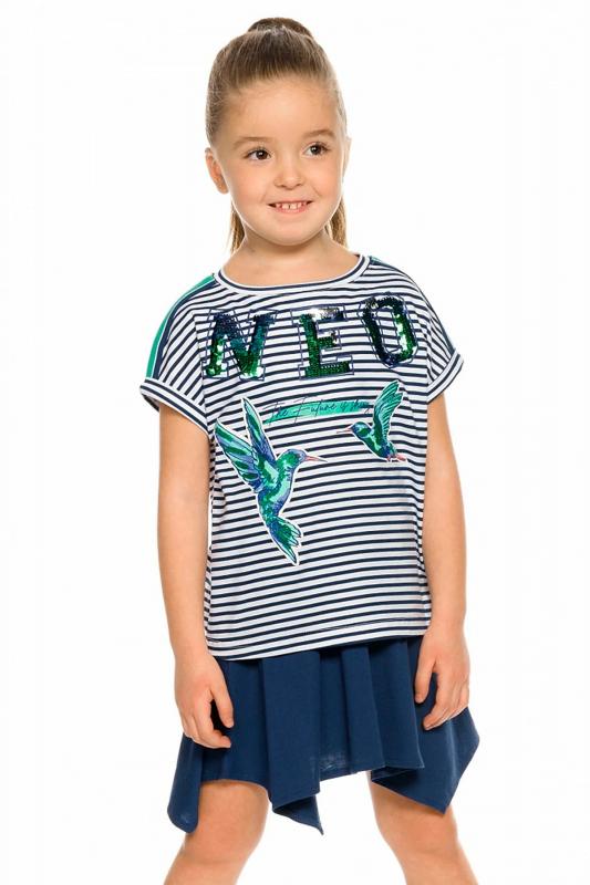 Комплект для девочек футболка и юбка. Футболка свободного объёма с цельнокроеным рукавом с отгибающейся закрепленной манжетой. Вдоль линии плеч настрочена декоративная трикотажная тесьма. По переду изделия принт с разноцветным глиттером в виде птичек колибри и надписи, перевод Блестящее будущее , и вышивка из переливающихся переворачивающихся пайеток. Юбка - Новинка. Прямоугольная юбка с фигурной угловатой линией низа, пояс на широкой внутренней резинке.