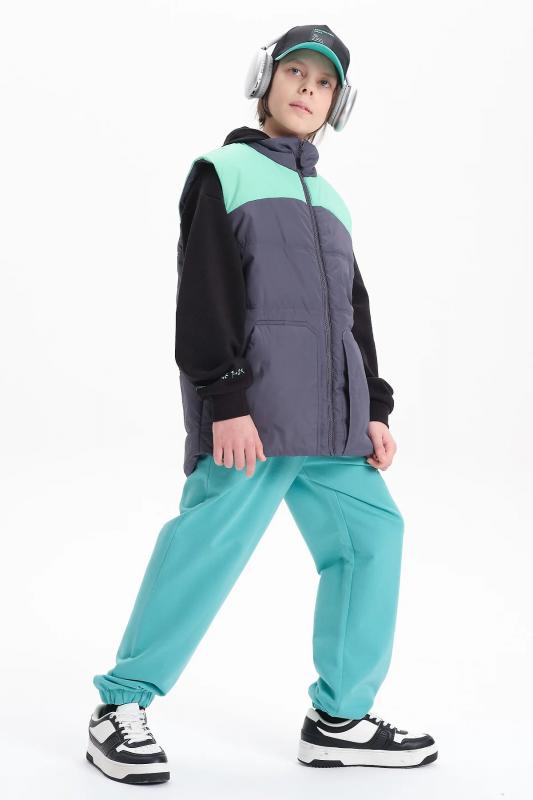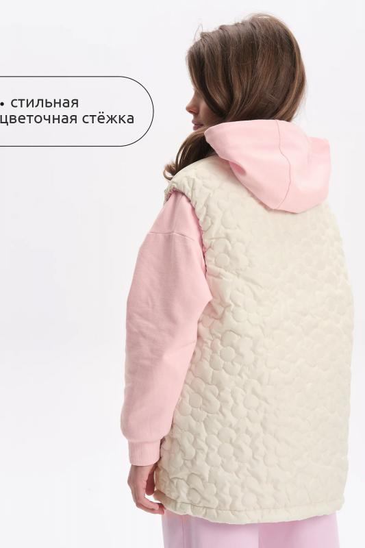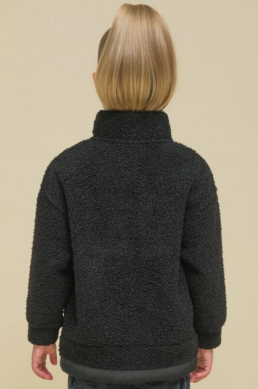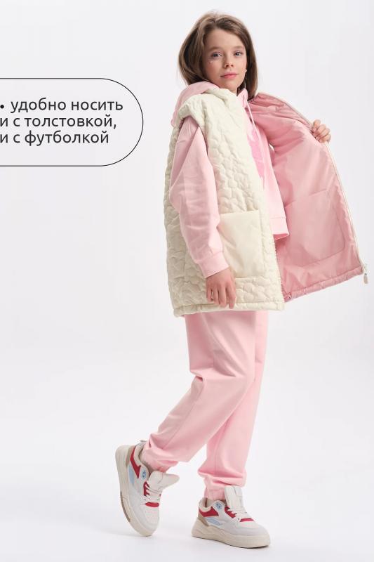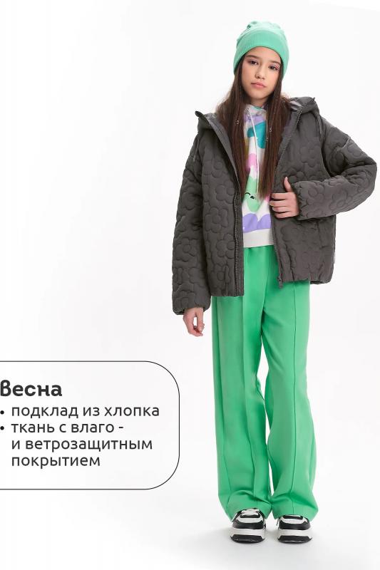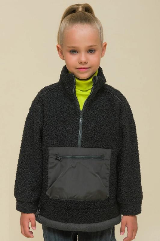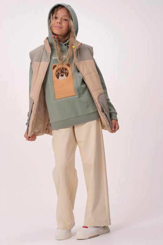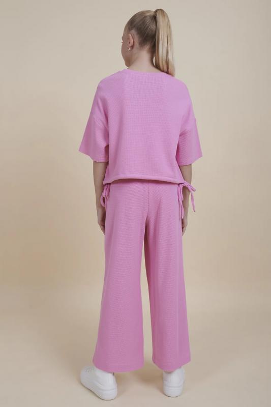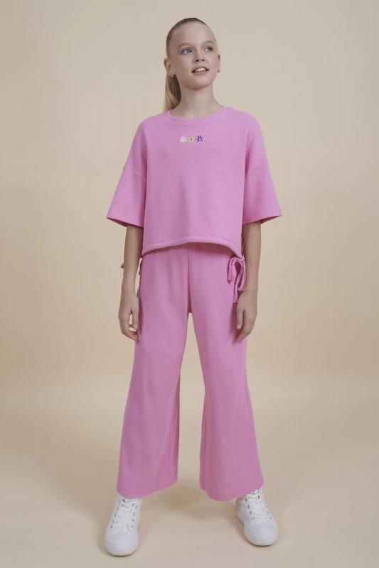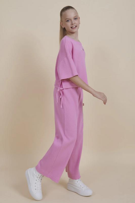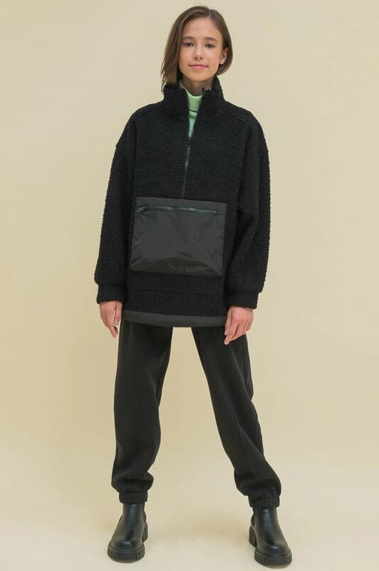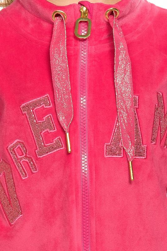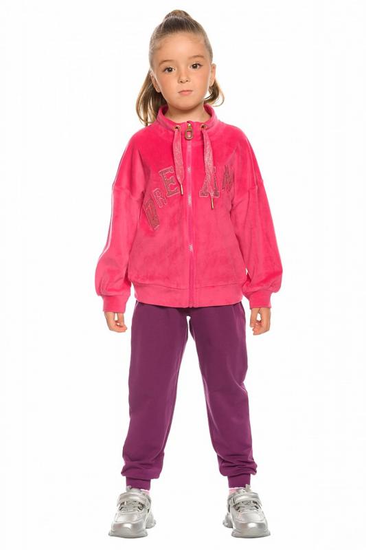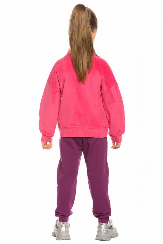 Комплект для девочек толстовка и брюки. Толстовка оверсайз силуэта из велюрового трикотажного полотна с перламутровым отливом. Слегка расширенный рукав собран на манжету из основной ткани. Воротник стойка с большими металлическими люверсами и декоративными лентами с люрексом и металлическими наконечниками. Застёжка на тракторную молнию с металлическим пуллером. По переду аппликация из пайеток. Перевод Мечта. Брюки из футера на манжете из рибаны актуального увеличенного объема без защипов. Пояс из основной ткани с эластиком внутри и дополнительной регулировкой объема шнурком.