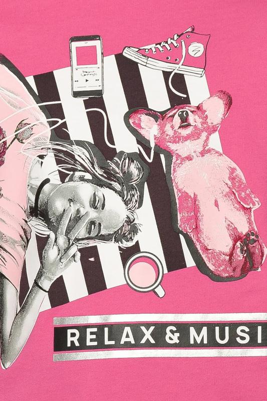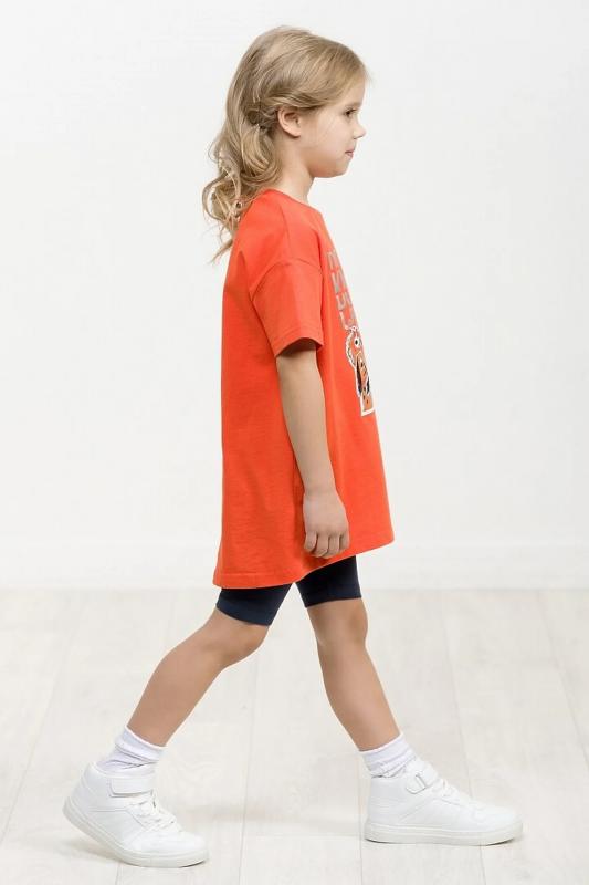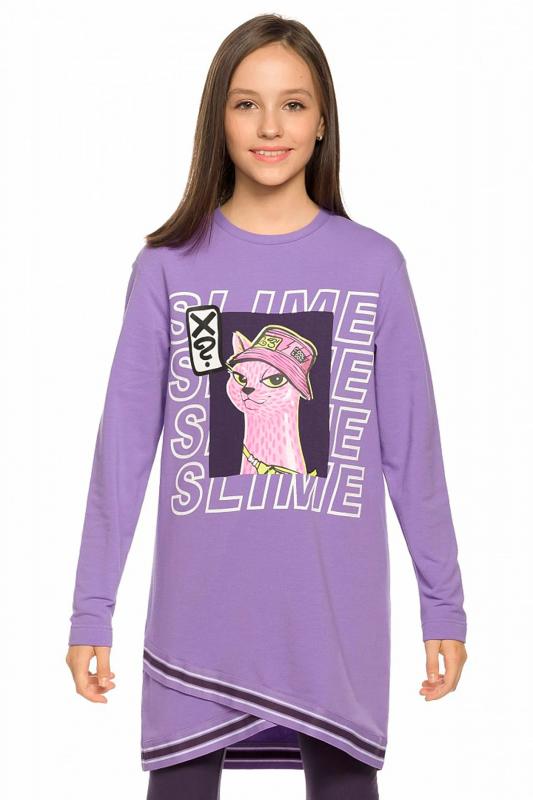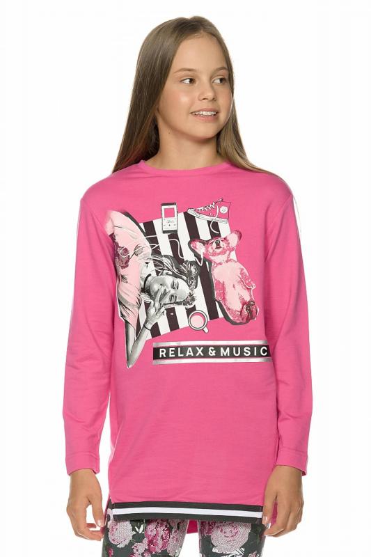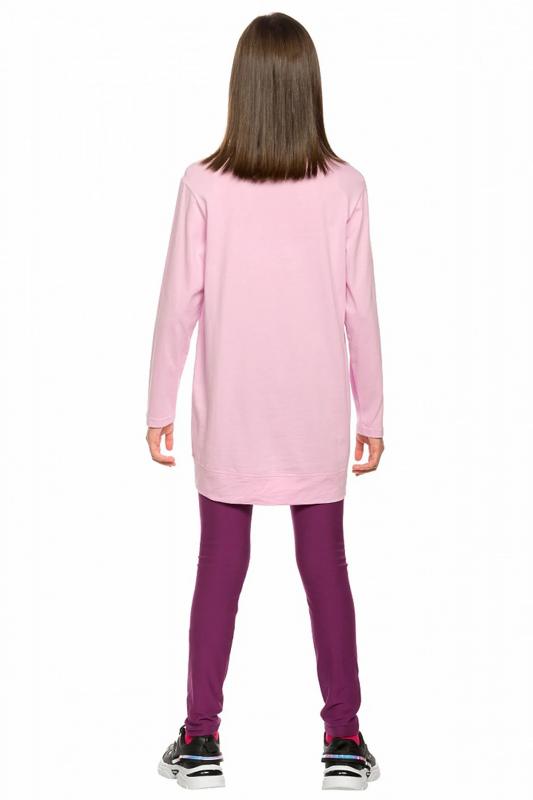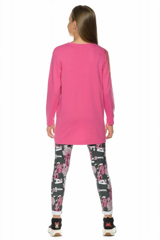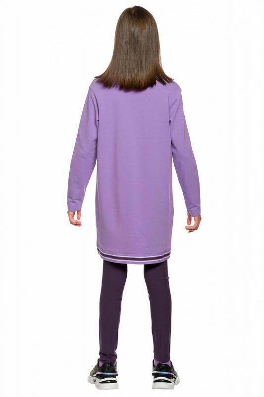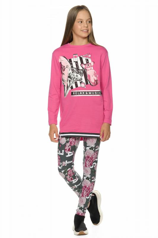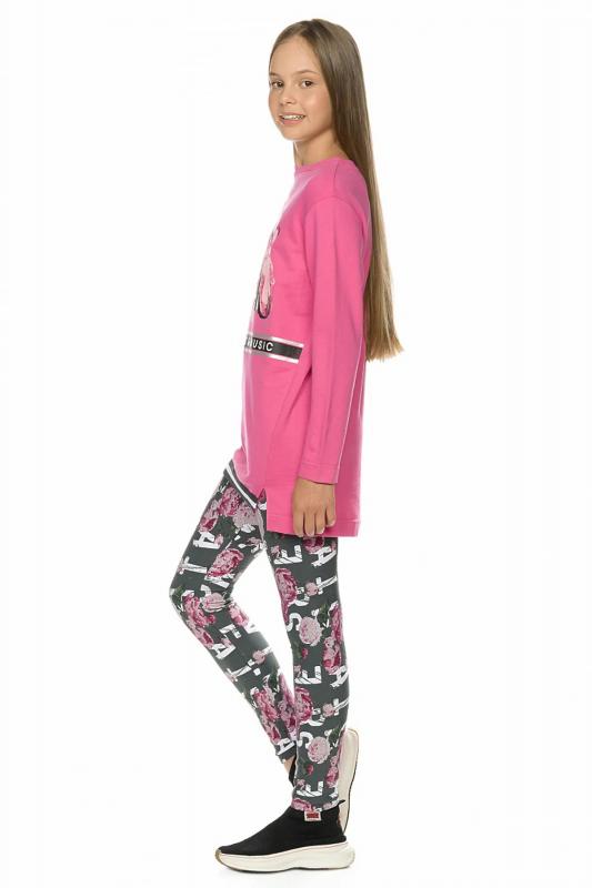Комплект для девочек: туника и лосины. Туника из футера умеренного объёма, рукав небольшого объема, слегка зауженный книзу, боковые швы переведены на перед, внизу с разрезами, по низу переда настрочена трикотажная тесьма, перепад длины переда и спинки, перевод Расслабься и послушай музыку. Классические лосины из футера с начесом. Состав: верх: 100%хлопок, низ: 95%хлопок 5%эластан"