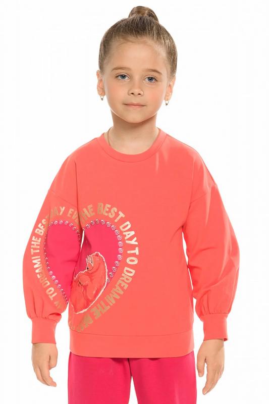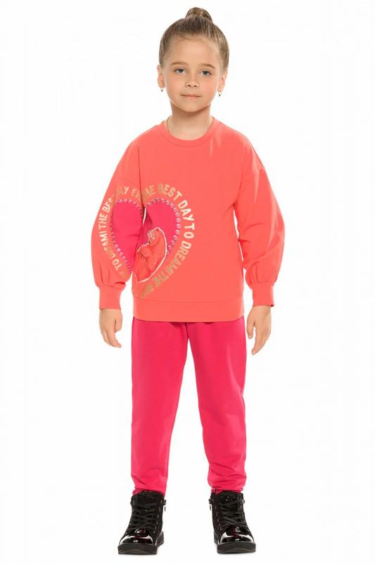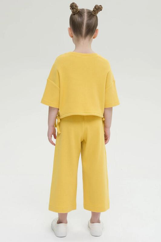 Комплект из футера для девочек свитшот и брюки. Свитшот О силуэта с сильно спущенным плечом. Широкий рукав собирается на манжету из плотного трикотажа, образуя по низу красивую сборку. В правой части изделия и на правом рукаве расположен единый мягкий эластичный принт и текст из золотого металлика Лучший день, чтобы мечтать. По низу изделия манжета из плотного трикотажа. Брюки из футера. Современный увеличенный объем по всей длине брюк. Защипы на поясе. Пояс на резинке с дополнительной внутренней регулировкой шнурком.