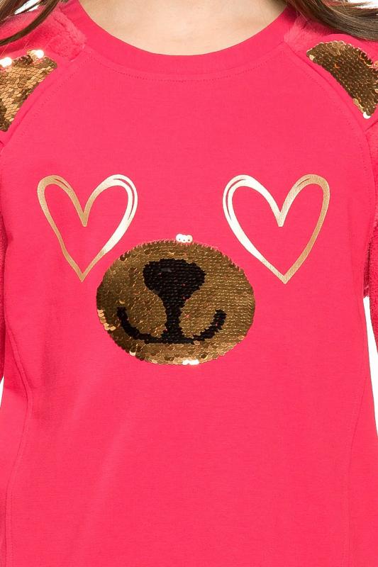 Комплект для девочек туника и лосины. Туника из футера с рукавами реглан из велсофта. На переде рельефные швы, создающие силуэт лёгкий бочонок. В швах рукава вшиты декоративные ушки, расшитые золотистыми пайетками. По переду принт из мягких стойких золотых сердечек и вышивки из пайеток, имитирующие мордочку медведя. Лосины из эластичного футера с начесом.