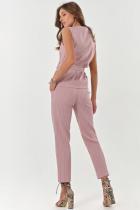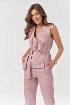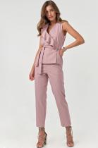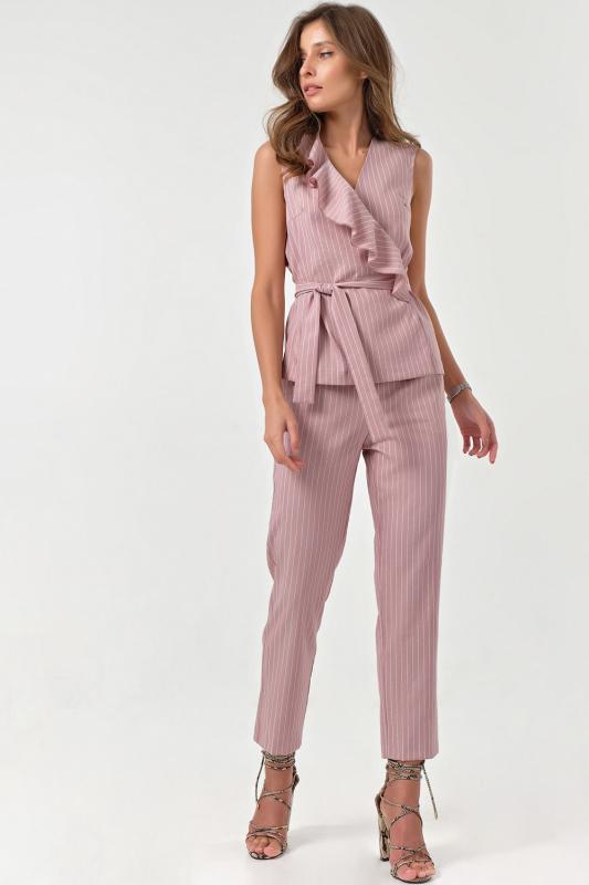 • Особенности: Костюм состоит из блузы прямого силуэта и укороченных брюк прилегающего силуэта. Детали блузы: на правой полочке волан, застежка на потайную кнопку, длинный пояс. Детали брюк: брючные карманы, притачной пояс с застежкой на две пуговицы.