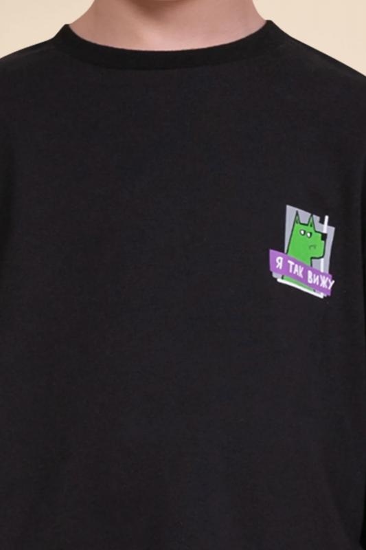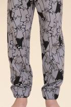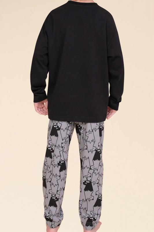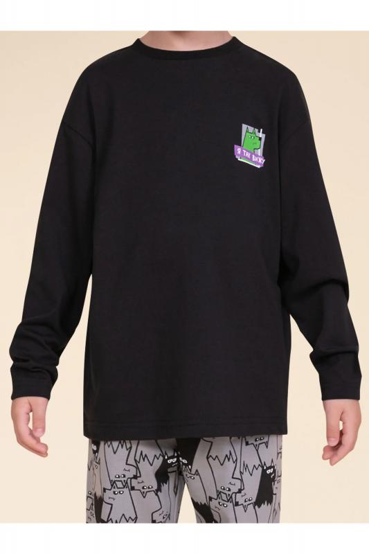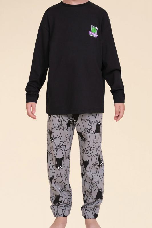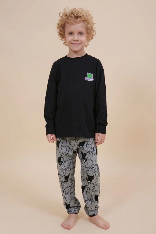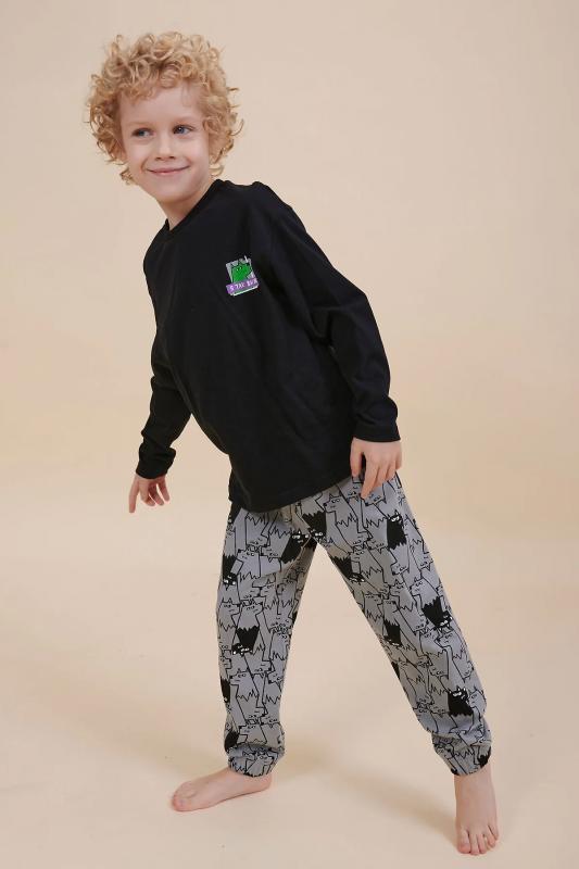 Стильная и уютная пижама для мальчика. В составе ткани 100% хлопка — идеально для детской одежды! Модель приятна на ощупь, прекрасно пропускает воздух, позволяя коже ребёнка дышать. При этом в пижаме из хлопка ребёнку будет тепло, даже если он сбросит одеяло. Всё это обеспечивает комфортный и качественный сон. Джемпер и брюки среднего объёма, плечо немного спущено, рукава широкие и свободные — пижама на мальчика очень удобна для сна. Широкие и мягкие резинки в поясе и по низу брюк не перекручиваются и не давят. Отделка горловины из эластичной рибаны — она не растягивается, ребёнку удобно надевать и снимать пижаму. Брюки декорированы сплошным принтом с забавными собаками, будто нарисованными от руки. Джемпер чёрного цвета украшает забавный принт в виде зелёной собаки и надписи "