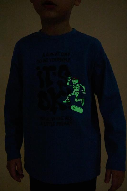 Пижама детская для мальчика. Натуральный состав ткани (100% хлопка) обеспечивает изделию мягкость, гипоаллергенность и воздухопроницаемость. Благодаря этому сон комфортный и качественный. В пижаме из хлопка ребёнку будет тепло, даже если он сбросит одеяло. Джемпер и брюки умеренного объёма, рукава широкие и свободные — комплект для сна очень удобен. В поясе и по низу брюк мягкая и широкая резинка — не перекручивается и не давит. Отделка горловины джемпера из эластичной рибаны — ребёнку удобно надевать и снимать пижаму. А также рибана сохраняет отличную форму надолго. Хлопковая пижама украшена забавным принтом в готическом стиле, надписи переводятся: «хороший день, чтобы быть собой», «всё окей!», «все мы немного странные». Фишка модели — принт светится в темноте! Такая особенность непременно понравится любому ребёнку. Детская пижама для мальчика неприхотлива в уходе. Принт эластичный и мягкий, без проблем переносит частые стирки. Детская пижама с брюками подходит для сна как дома, так и в детском саду — отлич