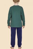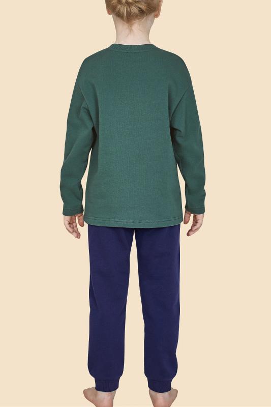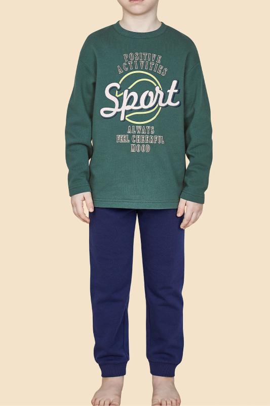 Пижама детская для мальчика утепленная. Натуральный состав ткани из 100% хлопка (футер с начёсом) обеспечивает изделию мягкость, гипоаллергенность и воздухопроницаемость. Благодаря этому сон комфортный и качественный. В пижаме из хлопка ребёнку будет тепло, даже если он сбросит одеяло. Джемпер и брюки умеренного объёма, рукава широкие и свободные — комплект для сна очень удобен. В поясе и по низу брюк мягкая и широкая резинка — не перекручивается и не давит. Отделка горловины джемпера из эластичной рибаны — ребёнку удобно надевать и снимать пижаму. А также рибана сохраняет отличную форму надолго. Хлопковая пижама украшена стильным принтом в актуальной университетской эстетике, надписи переводятся: «позитивная деятельность», «спорт!», «всегда чувствуй себя хорошо». Детская пижама для мальчика неприхотлива в уходе. Принт эластичный и мягкий, без проблем переносит частые стирки. Детская пижама с брюками подходит для сна как дома, так и в детском саду — отличный выбор для вашего ребёнка! Помните о правильном ухо