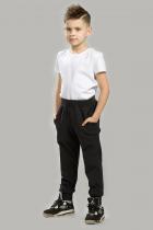 Брюки для мальчиков. Трикотажные спортивные брюки с новым силуэтом — удобные, небольшого объема. Низ и пояс обработаны манжетой из риба. В боковых швах наклонные карманы. Для дополнительной регулировки по талии в пояс вставлен эластик и шнурок.