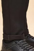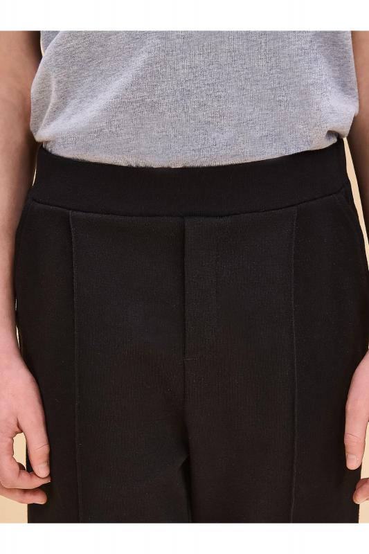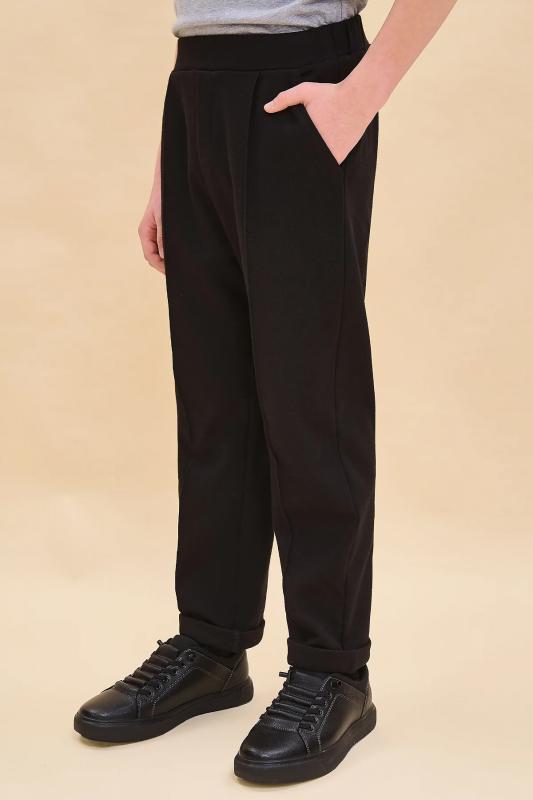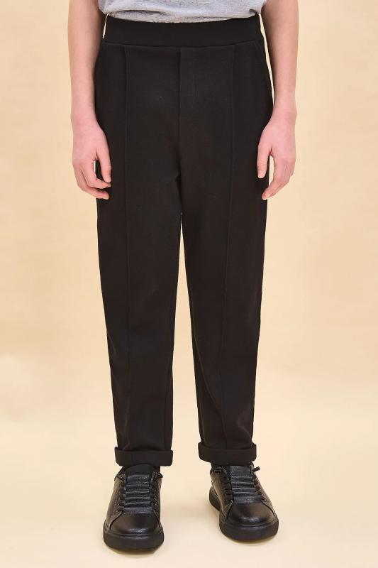 Трикотажные брюки с имитацией швейных из формоустойчивого трикотажа. Брюки с карманами в боковых швах. Гладкий пояс на переде, имитация застежки с гульфиком, имитация кармана с листочкой на спинке. Брюки можно носить с отворотами и без.
