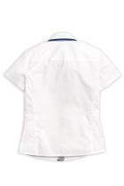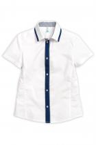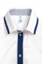 Рубашка для мальчиков с коротким рукавом. Новинка. Сорочка полуприлегающего силуэта с рельефами из проймы на переде и спинке. Воротник типа Windsor. По внешнему краю воротника декоративная окантовка контрастного цвета. В поддержку отделки на воротнике из такой же ткани контрастного цвета выполнены внешняя сторона стойки воротника, верхняя планка (с петлями). Нижняя планка (с пуговицами), внутренняя стойка воротника и узкий декоративный кант вдоль планки на левой части переда выполнены из отделочной ткани в мелкую полоску. По воротнику проходит декоративная строчка контрастного цвета, имитирующая ручной стежок.