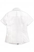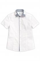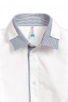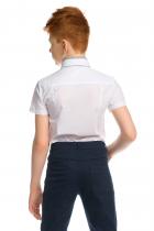 Рубашка для мальчиков с коротким рукавом. Сорочка прилегающего силуэта с вертикальными рельефами на переде и спинке. Двойной воротник с высокой стойкой. Верхний воротник из основной ткани крепится пуговицами к нижней части воротника из ткани в мелкую полоску контрастного цвета. Внутренняя часть стойки, нижняя часть планки (с пуговицами) также из ткани в полоску.