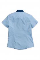 Рубашка для мальчиков с коротким рукавом. Сорочка прилегающего силуэта с вертикальными рельефами на переде и спинке. Воротник классическая невысокая стойка из ткани контрастного цвета, с отгибающимися уголками в цвет основной ткани, пристегивающимися на пуговицы к стойке. Карман с имитацией выглядывающего платка в цвет воротника-стойки.