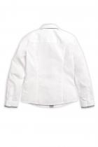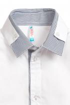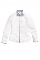 Рубашка для мальчиков с длинным рукавом. Сорочка прилегающего силуэта с вертикальными рельефами на переде и спинке. Двойной воротник с высокой стойкой. Верхний воротник из основной ткани крепится пуговицами к нижней части воротника из ткани в мелкую полоску контрастного цвета. Внутренняя часть стойки, нижняя часть планки (с пуговицами) и нижняя часть манжет также из ткани в полоску.