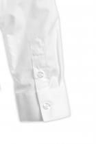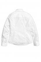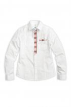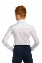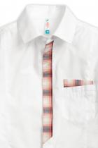 Рубашка для мальчиков с длинным рукавом. Сорочка прилегающего силуэта с вертикальными рельефами на переде и спинке. Супатная (потайная) застежка по переду. Верхняя часть планки из ткани в клетку имитирует галстук. Карман с имитацией выглядывающего платка в цвет галстука.