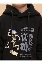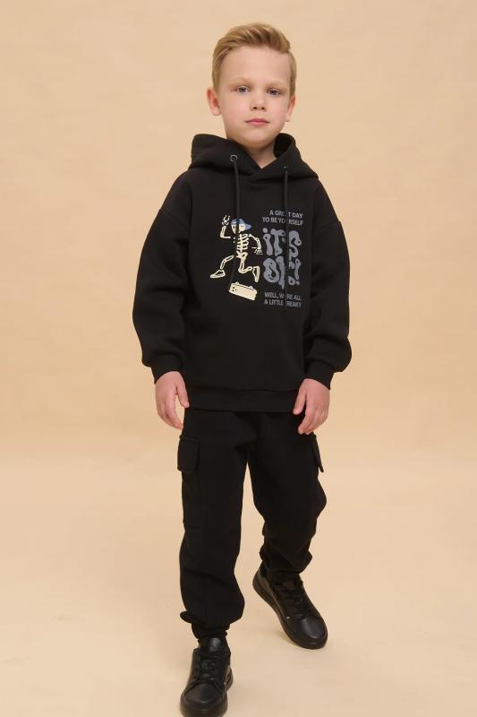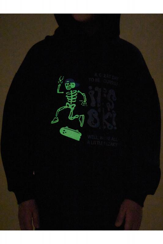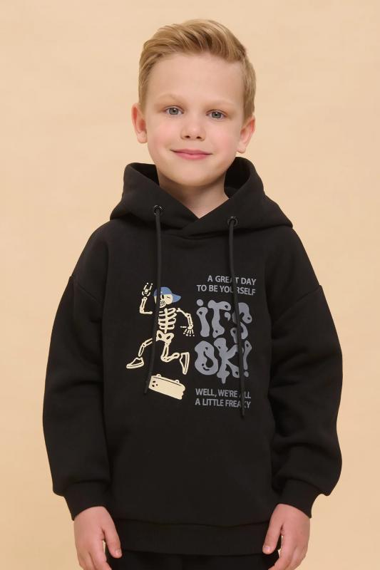 Толстовка детская из футера с начёсом для мальчика. Худи трендового оверсайз-силуэта со спущенным плечом подарит ребёнку комфорт и не будет стеснять его движений. Толстовка с капюшоном защитит от холода и ветра. Модель дополнена манжетами из эластичной рибаны по низу и рукавам. Рибана не растягивается и надолго сохраняет отличный внешний вид. Изделие неприхотливо в уходе. Толстовка на мальчика выполнена из ткани с высоким содержанием хлопка — модель приятная на ощупь, дышащая и гипоаллергенная. Благодаря полиэстеру худи износостойкое, сохраняет форму даже после множества стирок. Изделие выполнено в универсальной расцветке, легко комбинируется с любыми брюками, джинсами. Толстовка декорирована принтом в актуальном готическом стиле, надписи переводятся: «хороший день, чтобы быть собой», «все окей!», «все мы немного странные». Принты эластичные и устойчивые, не боятся частых стирок. Фишка модели — принты светятся в темноте! Это не оставит равнодушным ни одного ребёнка! Отличное худи оверсайз для мальчиков дошко