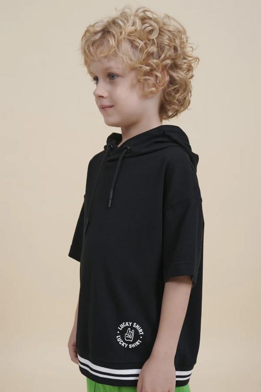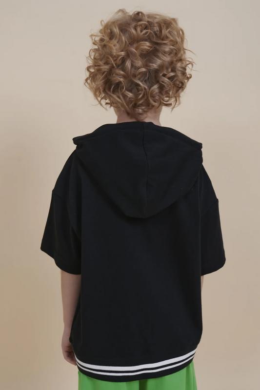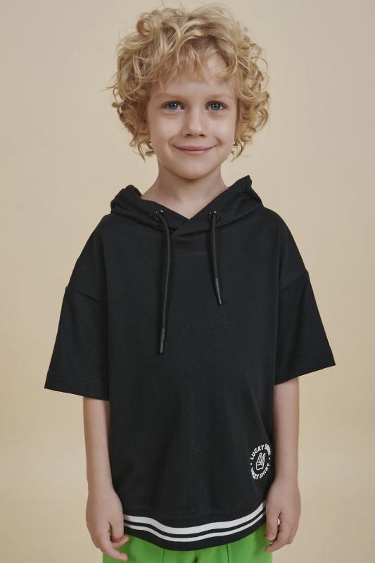 Футболка для мальчика оверсайз с капюшоном – модель большого объема на каждый день, для дома и прогулок. Базовая футболка на любой сезон. Изделие сшито из 100% натурального хлопка. Футболка детская для мальчика из мягкого материала приятно прилегает к телу, не вызывая дискомфортных ощущений во время движений. Хлопок хорошо пропускает воздух, обеспечивает гигроскопичность. Материал не задерживает влагу - ребенок не потеет. По низу изделие оформлено манжетой из декоративного риба. Одношовный капюшон с утяжкой на круглый, плотный шнур. Футболка для мальчика прослужит долго и будет радовать износостойкостью. Модель представлена в черном цвете. Черная футболка для мальчика с капюшоном – стильный вариант на любой выход, по переду нюансная надписью "