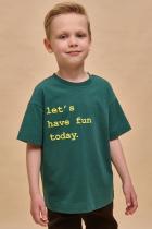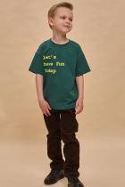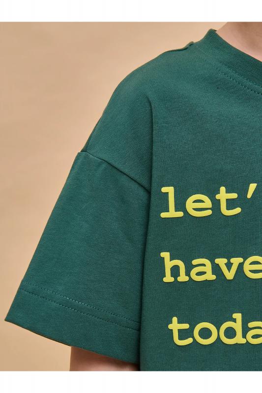 Детская футболка для мальчика. Комфортная майка свободного объёма со спущенным плечом не будет стеснять движений ребёнка. Вырез горловины обработан эластичной рибаной (ткань в рубчик) — она прекрасно держит форму, не растягивается, при этом ребёнку удобно надевать и снимать футболку. Изделие неприхотливо в уходе. Футболка детская с принтом в актуальном университетском стиле по переду. Надпись переводится: «давайте веселиться сегодня». Принт эластичный и прочный, не боится частых стирок. В составе ткани 100% хлопка — майка мягкая, дышащая, приятная на ощупь. Футболка для мальчиков выполнена в универсальном цвете, её легко комбинировать с различными брюками, шортами. Детские футболки с принтом подходят как для маленьких мальчиков, так и для подростков. Оверсайз-футболка для мальчика подходит для любого времени года, её можно носить как летом, так и в холодное время года в качестве среднего слоя одежды. Помните о правильном уходе за изделием: рекомендуется стирать при температуре не выше 30 °C, без предваритель