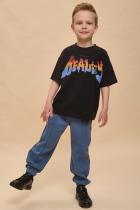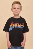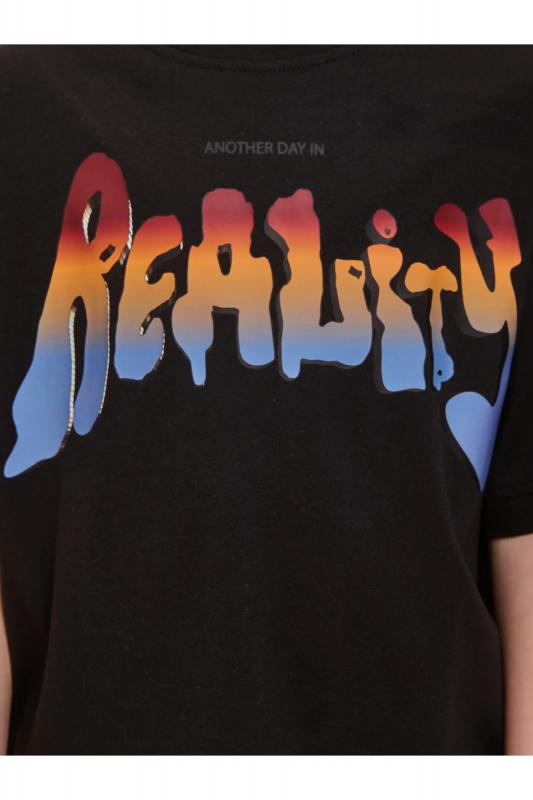 Детская футболка для мальчика. Комфортная майка трендового супероверсайз объёма со спущенным плечом не будет стеснять движений ребёнка. Вырез горловины обработан эластичной рибаной (ткань в рубчик) — она прекрасно держит форму, не растягивается, при этом ребёнку удобно надевать и снимать футболку. Изделие неприхотливо в уходе. Футболка детская с принтом в актуальном готическом стиле по переду и спинке. Надпись переводится: «ещё один день в реальности». Принт эластичный и прочный, не боится частых стирок. В составе ткани 100% хлопка — майка мягкая, дышащая, приятная на ощупь. Футболка для мальчиков выполнена в универсальном цвете, её легко комбинировать с различными брюками, шортами. Детские футболки с принтом подходят как для маленьких мальчиков, так и для подростков. Оверсайз-футболка для мальчика подходит для любого времени года, её можно носить как летом, так и в холодное время года в качестве среднего слоя одежды. Помните о правильном уходе за изделием: рекомендуется стирать при температуре не выше 30 °C