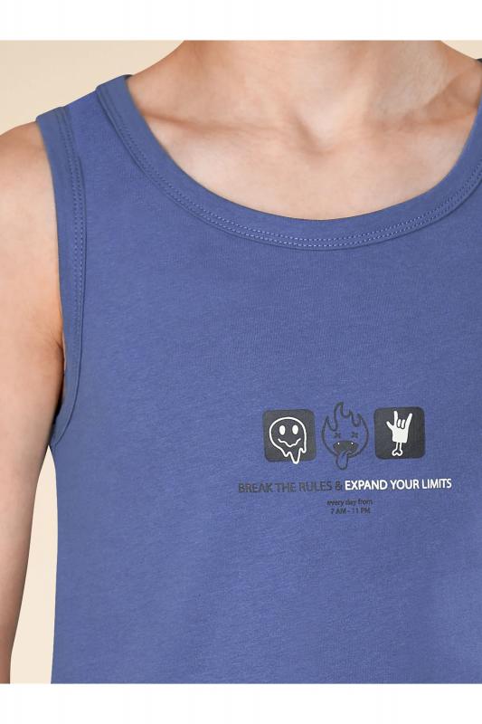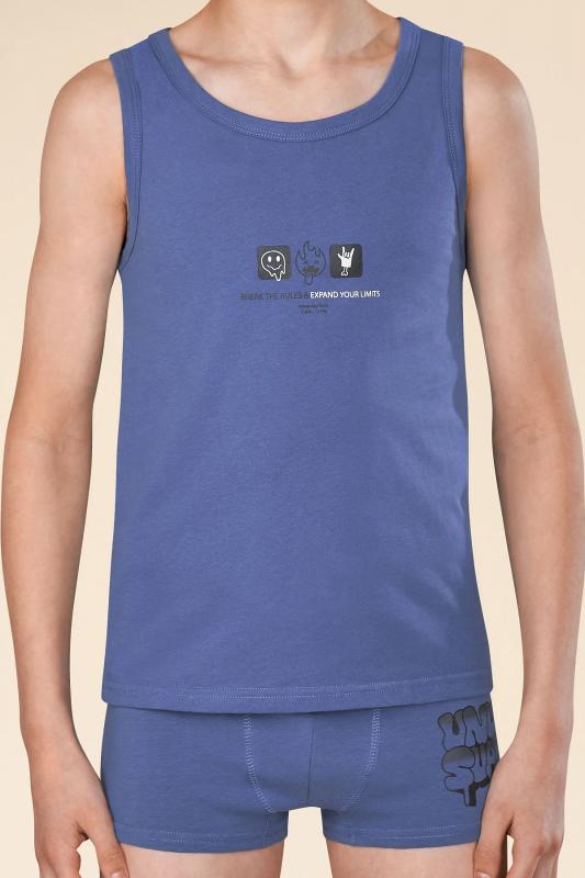 Майка детская из 100% хлопка для мальчика. Натуральный состав ткани обеспечивает изделию мягкость, гипоаллергенность и воздухопроницаемость. Майка детская для мальчиков комфортно сидит по фигуре, её можно надевать под рубашку, джемпер, свитер. Горловина и проймы изделия отделаны пайпингом в тон — они хорошо держат форму, надолго сохраняют аккуратный внешний вид. Хлопковая майка синего цвета украшена забавным принтом в готическом стиле, надпись переводится: «нарушай правила и расширяй границы своих возможностей каждый день с 7:00 до 23:00». Фишка модели — принт светится в темноте! Такая особенность непременно понравится любому ребёнку. Майка детская для мальчика неприхотлива в уходе. Принт эластичный и мягкий, без проблем переносит частые стирки. Нательная майка для мальчика подходит для повседневной носки, отдыха, а также для сна и дома. Помните о правильном уходе за изделием: рекомендуется стирать при температуре не выше 30 °C, без предварительного замачивания, с изнанки. Это поможет сохранить качество и цв