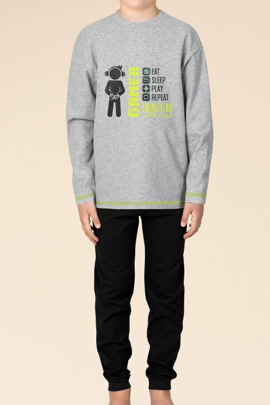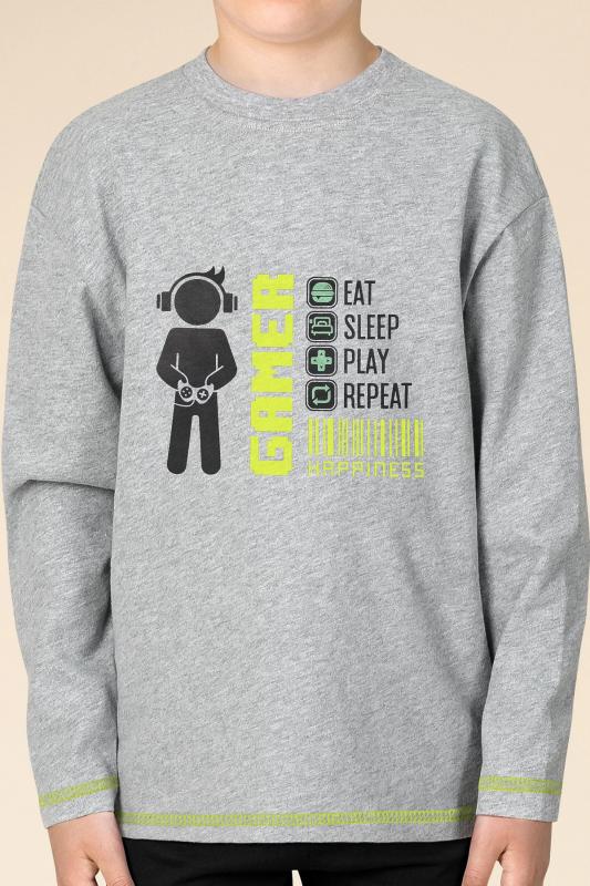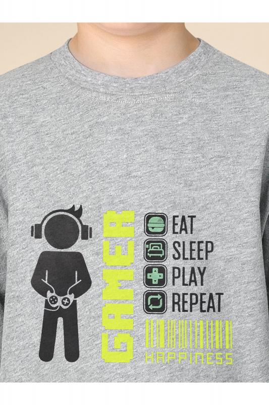 украшен контрастными строчками по низу и рукавам — один из модных трендов. По переду забавный принт геймерской тематики — порадует любого мальчишку! Перевод: "