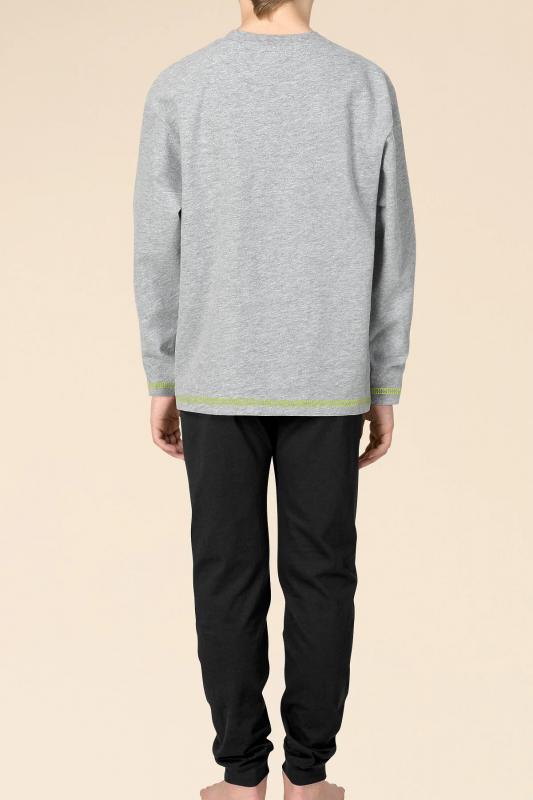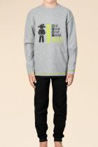 Уютная пижама для мальчика. Изделие выполнено из 100% хлопка — идеальный вариант для детской пижамы. Ткань из хлопка приятна на ощупь и превосходно пропускает воздух, позволяя коже ребёнка дышать. В пижаме из хлопка ребёнку будет комфортно, даже если он сбросит одеяло. Джемпер и брюки умеренного объёма, рукава свободные — пижама очень удобна для сна. В поясе брюк мягкая и широкая резинка — не перекручивается и не давит. Манжеты брюк и отделка горловины джемпера из эластичной рибаны — комплект удобно надевать и снимать. А также резинка отлично сохраняет форму в течение долгого времени. Брюки выполнены в практичном чёрном цвете и лаконичном дизайне. Джемпер актуального оттенка "