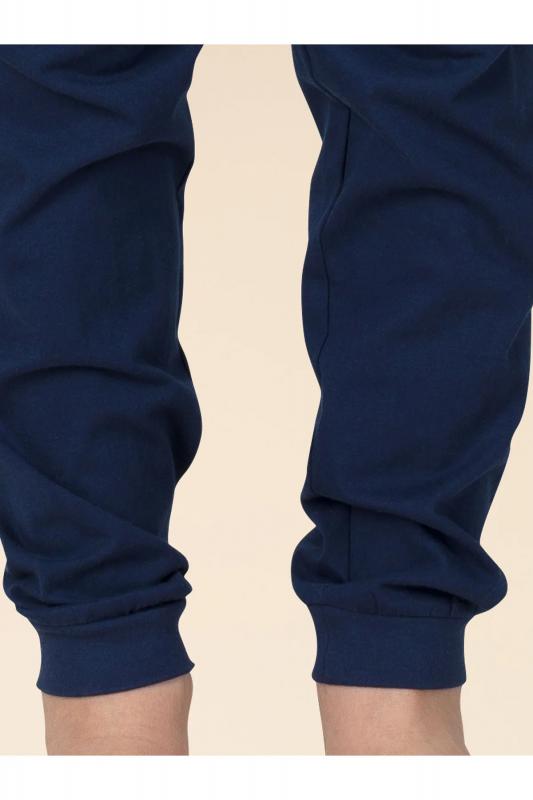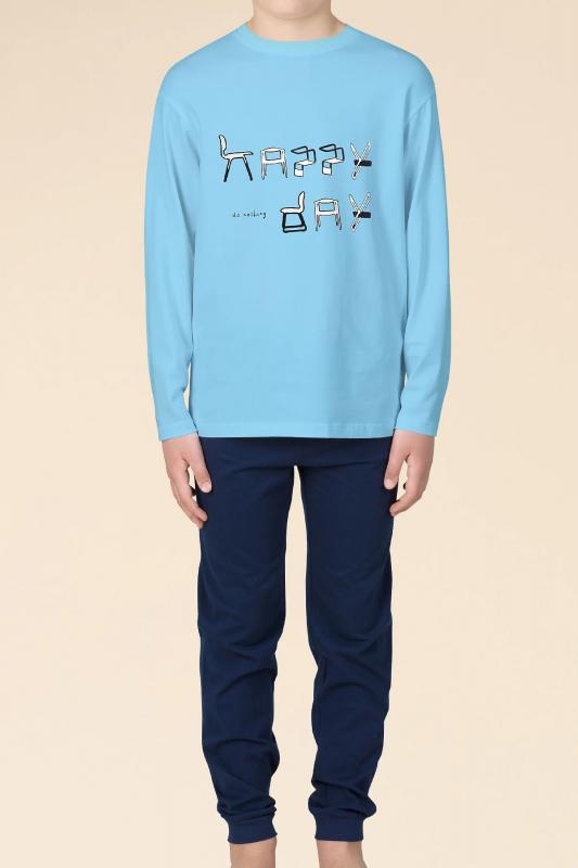 выполнена из 100% хлопка — оптимальный состав для детской пижамы. Изделие мягкое, отлично пропускает воздух, позволяя коже ребёнка дышать. При этом в пижаме из хлопка ребёнку будет комфортно, даже если он сбросит одеяло во сне. Джемпер и брюки среднего объёма, рукава свободные — в пижаме очень удобно спать. Широкая и мягкая резинка в поясе не перекручивается и не давит. Манжеты брюк и отделка горловины джемпера из эластичной рибаны — они не растягиваются, пижаму удобно надевать и снимать. Брюки выполнены в трендовом синем цвете и лаконичном дизайне. Джемпер голубого цвета декорирован уютным принтом с позитивным текстом. Перевод: "