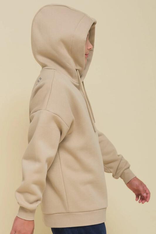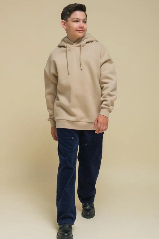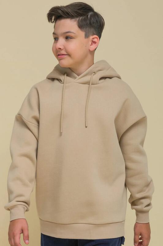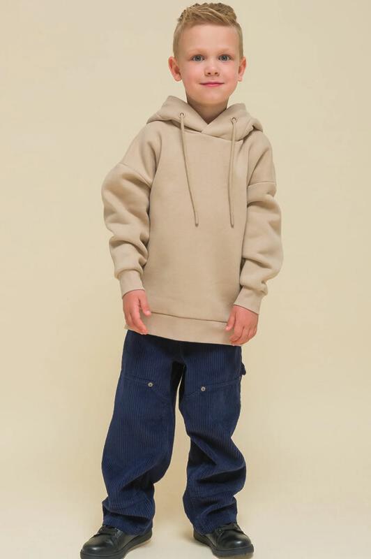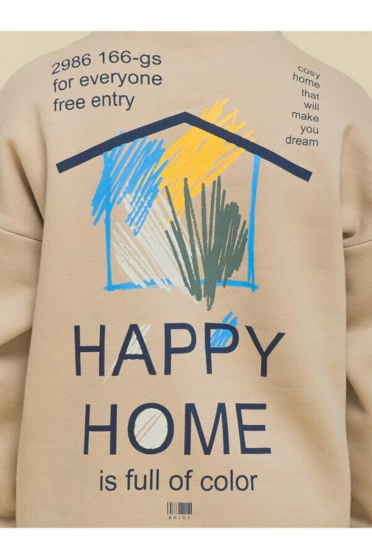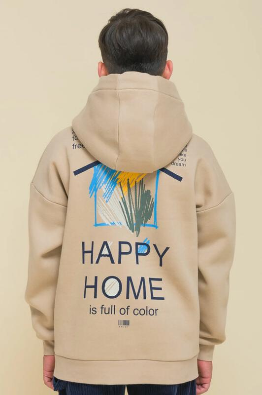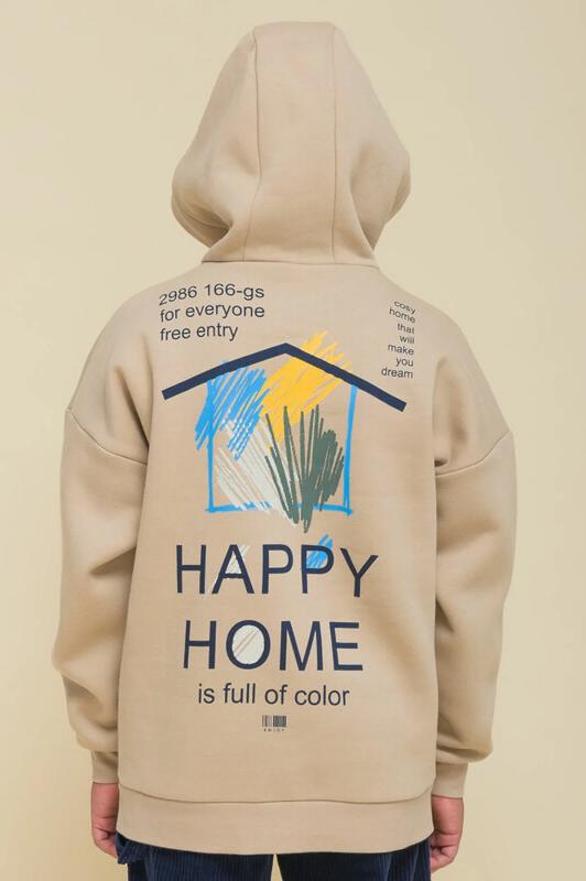 Детское худи с капюшоном для мальчика. Толстовка оверсайз-силуэта со спущенным плечом не будет стеснять движений ребёнка и подарит комфорт. Объёмное худи средней длины актуально в этом сезоне. Манжеты и пояс по низу изделия выполнены из эластичной рибаны (ткань в рубчик) — она не растягивается, сохраняет отличную форму надолго. Капюшон с двумя швами — это обеспечивает анатомически правильную форму и комфортную посадку по голове. Капюшон двойной, швы закрыты. Шнуром можно регулировать высоту и объём. Толстовка неприхотлива в уходе. Худи с принтом на спине выполнено из ткани с высоким содержанием качественного хлопка (футер с начёсом), что обеспечивает мягкость и хорошую воздухопроницаемость. Благодаря полиэстеру худи сохраняет цвет и форму в течение длительного времени. Модный принт в плакатном стиле изображает домик с текстом «уютный дом, который побуждает тебя мечтать», «счастливый дом полон цвета». Принт эластичный и стойкий, отлично переносит частые стирки. Худи бежевое — универсальный цвет, толстовку лег
