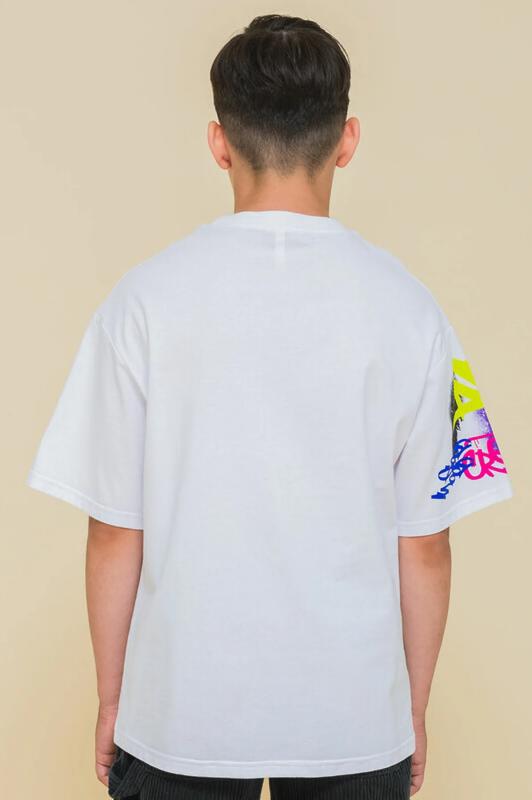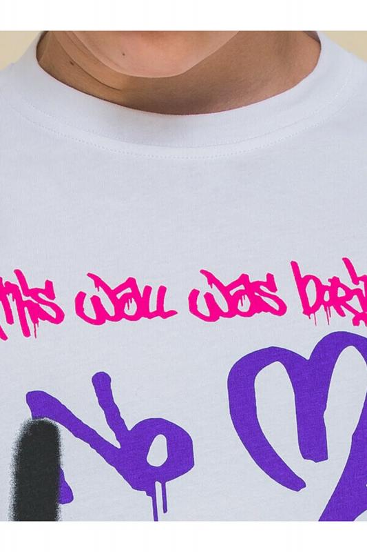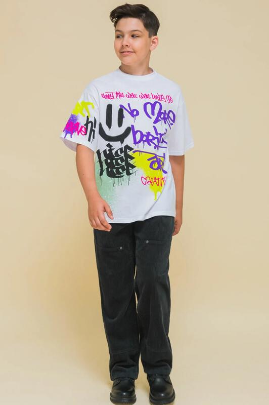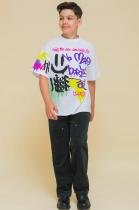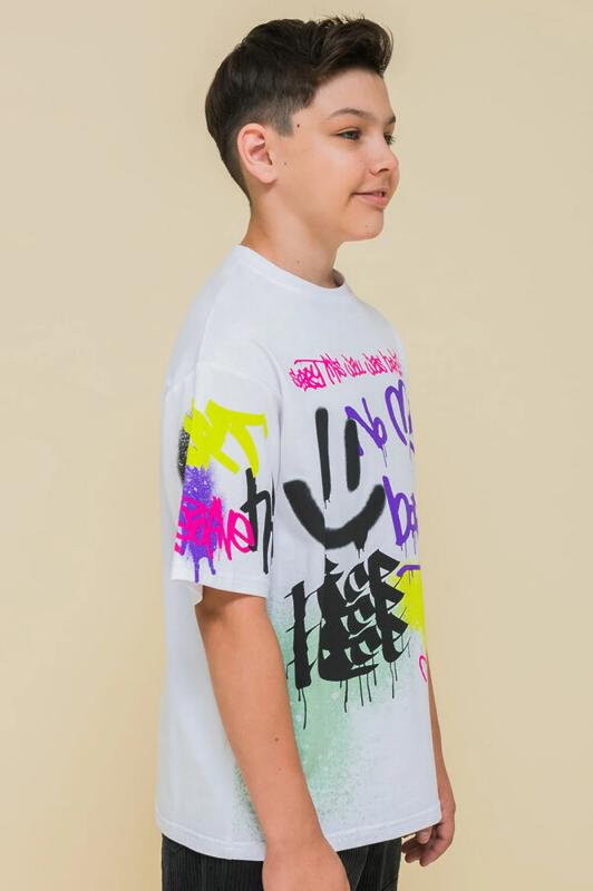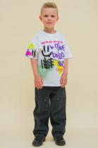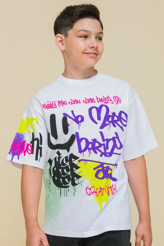 Детская футболка для мальчика. Комфортная майка свободного объёма не будет стеснять движений ребёнка. Джемпер с удлинёнными широкими рукавами — один из модных трендов сезона. Небольшой вырез горловины обработан широкой эластичной рибаной (ткань в рубчик) — она прекрасно держит форму, при этом ребёнку удобно надевать и снимать футболку. Изделие неприхотливо в уходе. Футболка с прикольным принтом в актуальном стиле граффити по переду и на левом рукаве. Надписи переводятся: «больше никакого скучного искусства», «извините, эта стена мне надоела, креативность», «приятный». Принты эластичные и прочные, не боятся частых стирок. В составе ткани 100% хлопка — майка мягкая, дышащая, приятная на ощупь. Футболка для мальчиков выполнена в белом цвете. Размерный ряд: 1 (86): 2 (92): 3 (98): 4 (104): 5 (110): 6 (116): 7 (122): 8 (128): 9 (134): 10 (140): 11 (146). Белая футболка оверсайз с принтом подходит как для маленьких мальчиков, так и для подростков. Её можно носить летом, осенью и весной (демисезон), зимой в качеств