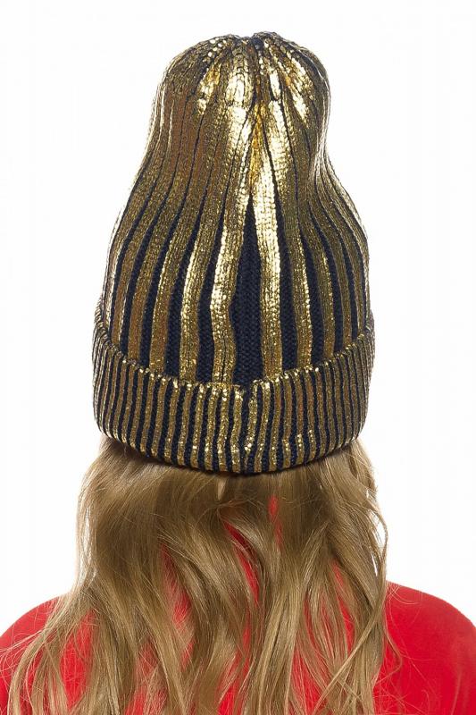 Вязаная шапка для девочек на флисе с отворотом и золотистым напылением.