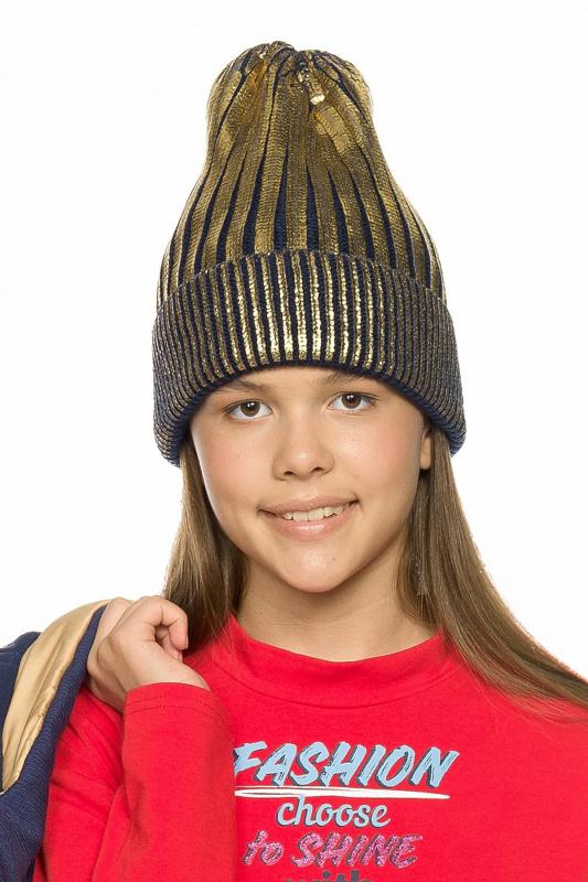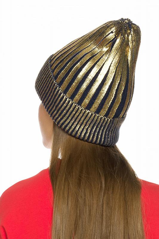 Вязаная шапка для девочек на флисе с отворотом и золотистым напылением.
