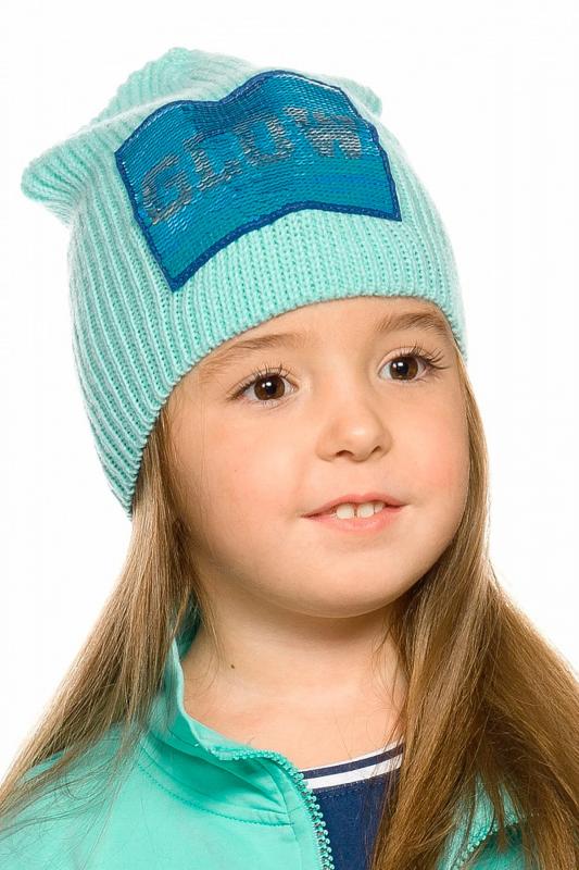 Шапка для девочек. Новая форма. Верхняя часть оформлена в виде треугольника. Однослойная вязаная шапка из акрила. По переду нашивка из переливающихся переворачивающихся пайеток с надписью, перевод Блеск .