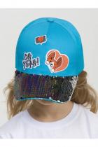 Кепка для девочек. Верх козырька кепки из двухсторонних пайеток фиолетового дуохрома и серебряного цвета. Декоративная вышивка. Перевод О, да. Застежка велькро.