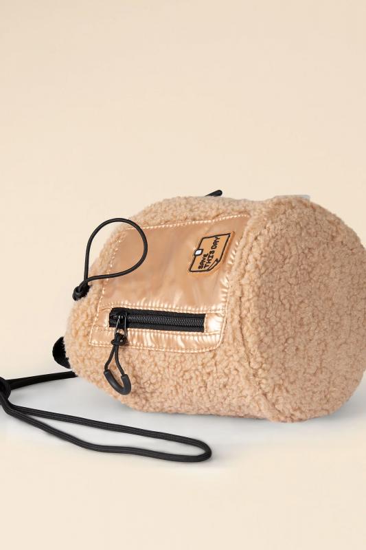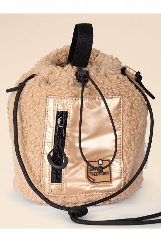 с фактурой барашка. Мягкая и приятная на ощупь, эта сумка напоминает плюшевую игрушку и будет любимым аксессуаром вашего ребенка. Сумка дополнена удобным затягивающимся шнурком с фиксатором, а также внутренним и внешним кармашками для важных мелочей. Силиконовая нашивка с жизнеутверждающим текстом и световозвращающий логотип бренда добавляют аксессуару оригинальности и безопасности. Регулируемый ремешок позволяет носить сумку на плече или в руке. Для этого предусмотрена специальная ручка-петля, которая находится внутри сумки. Порадуйте своего ребенка, выбрав для него эту модную и функциональную сумочку!