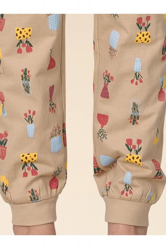 выполнена из 100% хлопка — оптимальный состав для детской пижамы. Ткань изделия тёплая, приятная на ощупь, превосходно пропускает воздух — кожа ребёнка дышит. Благодаря этому сон комфортный и качественный. Джемпер и брюки среднего объёма, плечо слегка спущено, рукава широкие и свободные — пижама очень удобна для сна. Широкая и мягкая резинка в поясе не перекручивается и не давит. Манжеты и отделка горловины эластичные — комплект удобно надевать и снимать. Пижама представлена в красивом бежевом цвете "