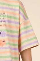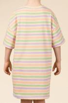 Стильная и уютная ночная сорочка для девочки в нежных пастельных оттенках. В составе ткани 100% хлопка — идеально для детской одежды! Модель приятна на ощупь, прекрасно пропускает воздух, позволяя коже ребёнка дышать. При этом в ночной рубашке из хлопка ребёнку будет уютно, даже если он сбросит одеяло. Всё это обеспечивает комфортный и качественный сон. Сорочка для девочки свободная, плечо немного спущено, рукава широкие — в ней очень удобно спать. Отделка горловины из эластичной рибаны — она не растягивается, ребёнку удобно надевать и снимать рубашку. Домашнее платье в полоску украшает милый принт в виде бабочек. Надписи переводятся: "