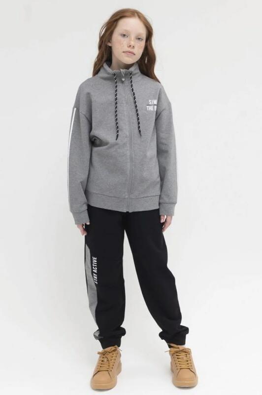 Трикотажный костюм для девочки из эластичного футера. Мягкий, но не растягивается и не мнётся. Манжеты не давят, но хорошо фиксируют. Легко отрегулировать объем брюк. Будет хорошо смотреться размер в размер и на вырост.Крепкая пластиковая молния не сломается и не потеряет зубчики даже от частого использования. Фишка костюма: стильные принты на рукаве куртки и на правой стороне брюк. В этом костюме любые движения будут в радость, а уход за ним займет минимум времени.