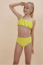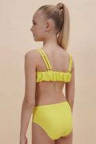— по низу и верху сборки. Топ двойной, не просвечивает. Двойные тонкие и мягкие бретели не сползают, исключают трение и раздражение. Сзади предусмотрена возможность регулировки длины бретелей. Трусы классические высокой посадки, аккуратные и комфортные. Детский купальник выполнен из полиамида и эластана — он прекрасно тянется, не теряя при этом своей формы, не выгорает и быстро сохнет. Модель представлена в четырёх трендовых цветах: голубой, жёлтый, розовый и зелёный. Купальный костюм однотонный, без декоративных элементов. В линейке представлены детские купальники следующих размеров: 3 (98): 4-5 (104-110): 6-7 (116-122): 8-9 (128-134): 10-11 (140-146). Купальник красивый подходит для девочек дошкольного, младшего школьного возраста и девочек-подростков. Идеальный вариант для летнего отдыха, пляжа, моря и бассейна. Модный купальник — замечательный подарок дочери, внучке или сестре на любой праздник. Выбирайте н
